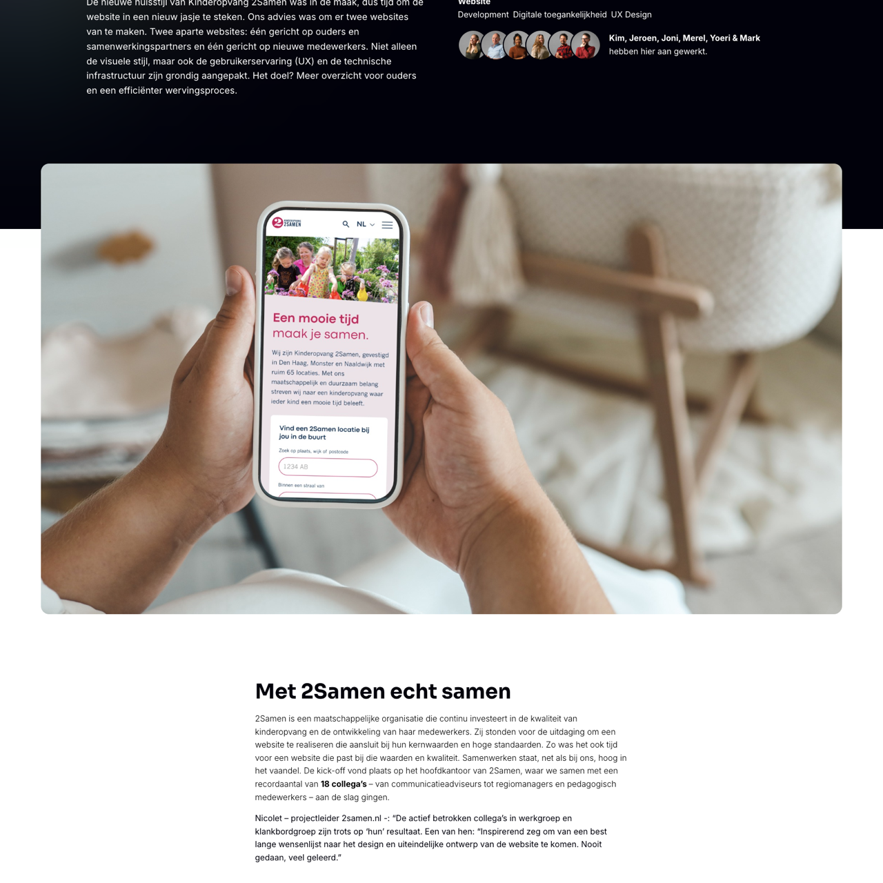2Samen transformed their website through a comprehensive UX redesign, creating two distinct platforms for parents and new employees. Using 10 interviews and prototypes, the team uncovered valuable insights to enhance user experience and streamline hiring. The result was a more intuitive interface, improved accessibility, and a faster, more effective onboarding process. Collaborating with 18 colleagues from across 2Samen, the project delivered a cohesive, high-quality digital experience that aligns with the organization's core values and standards.