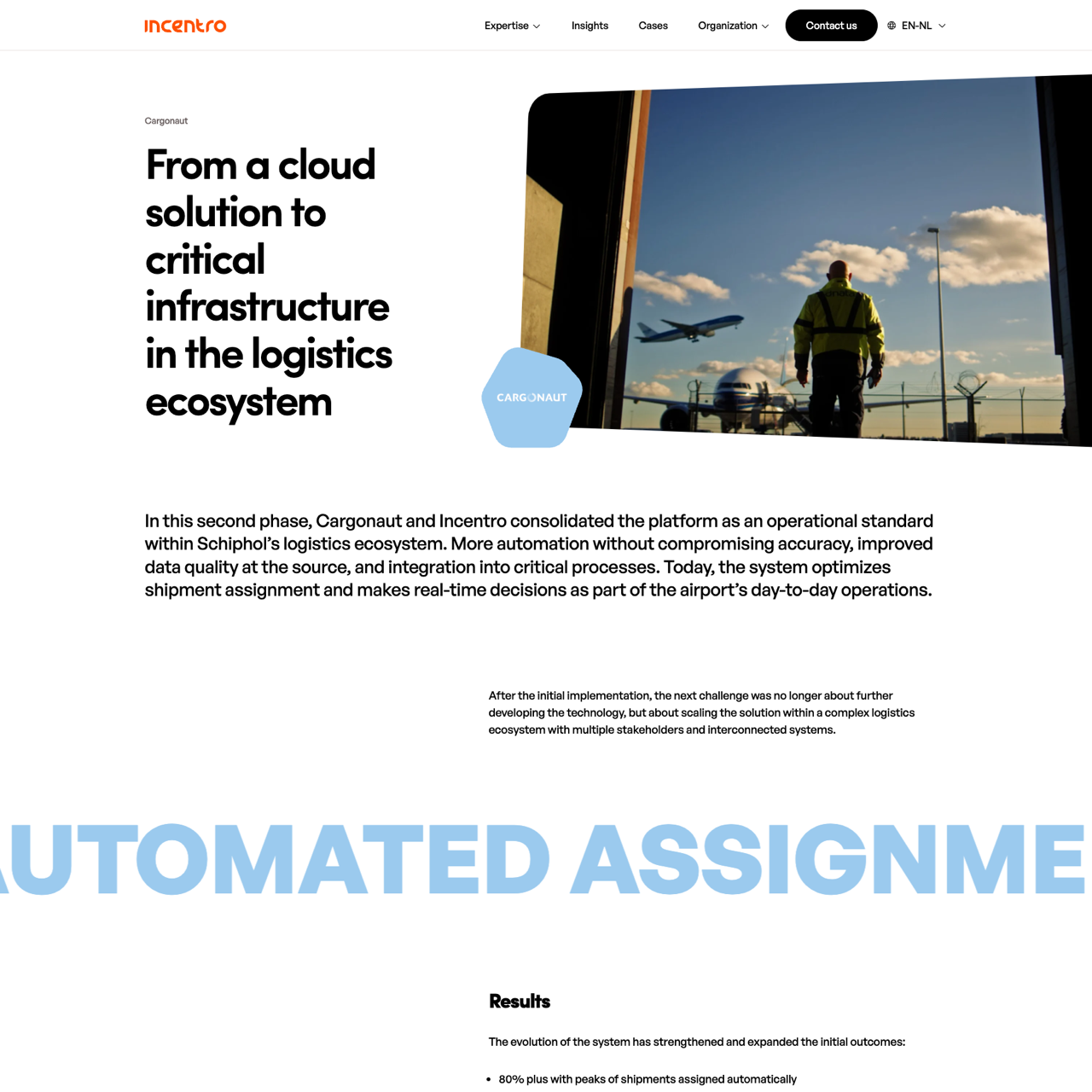 Cargonaut transformed its logistics operations with Incentro's platform, achieving 80% automated shipment assignment. The solution enhanced data quality and integration, enabling real-time decision-making. Key outcomes include 99% integration with ecosystem agents and significant error reduction. The platform now supports critical systems like Secure Import, making it a core component of Schiphol's daily operations.