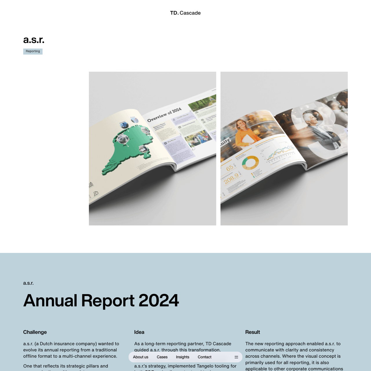 a.s.r. transformed its annual report into a multi-channel experience that aligns with its strategic pillars and communicates consistently across investor relations and corporate communications. total design guided the project, developing a visual concept and implementing tangelo tooling for both pdf and online output. the new approach enabled clear and consistent messaging across all channels, with the visual concept also applicable to other corporate communications. for its 2020 and 2024 reports, a.s.r. received the fd henri sijthoff award for best annual report.