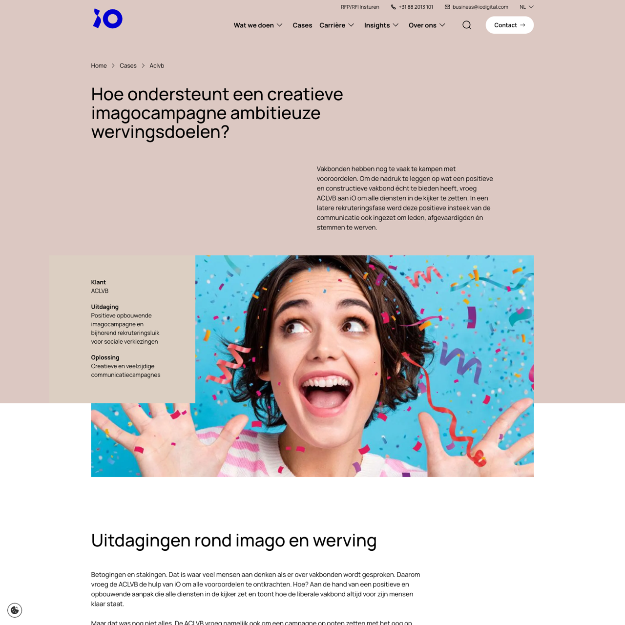 ACLVB faced challenges in changing perceptions and recruiting for social elections. iO Digital created a creative campaign with a slogan 'ACLVB werkt met je mee' to promote as a partner in life and work. They used multimedia and interactive elements like interviews and a quiz to engage the target audience. The campaign successfully increased recruitment by targeting the right profile, leading to more candidates. It highlighted the brand's commitment to members and expanded their reach through social media. The results showed a positive impact on brand image and recruitment numbers.