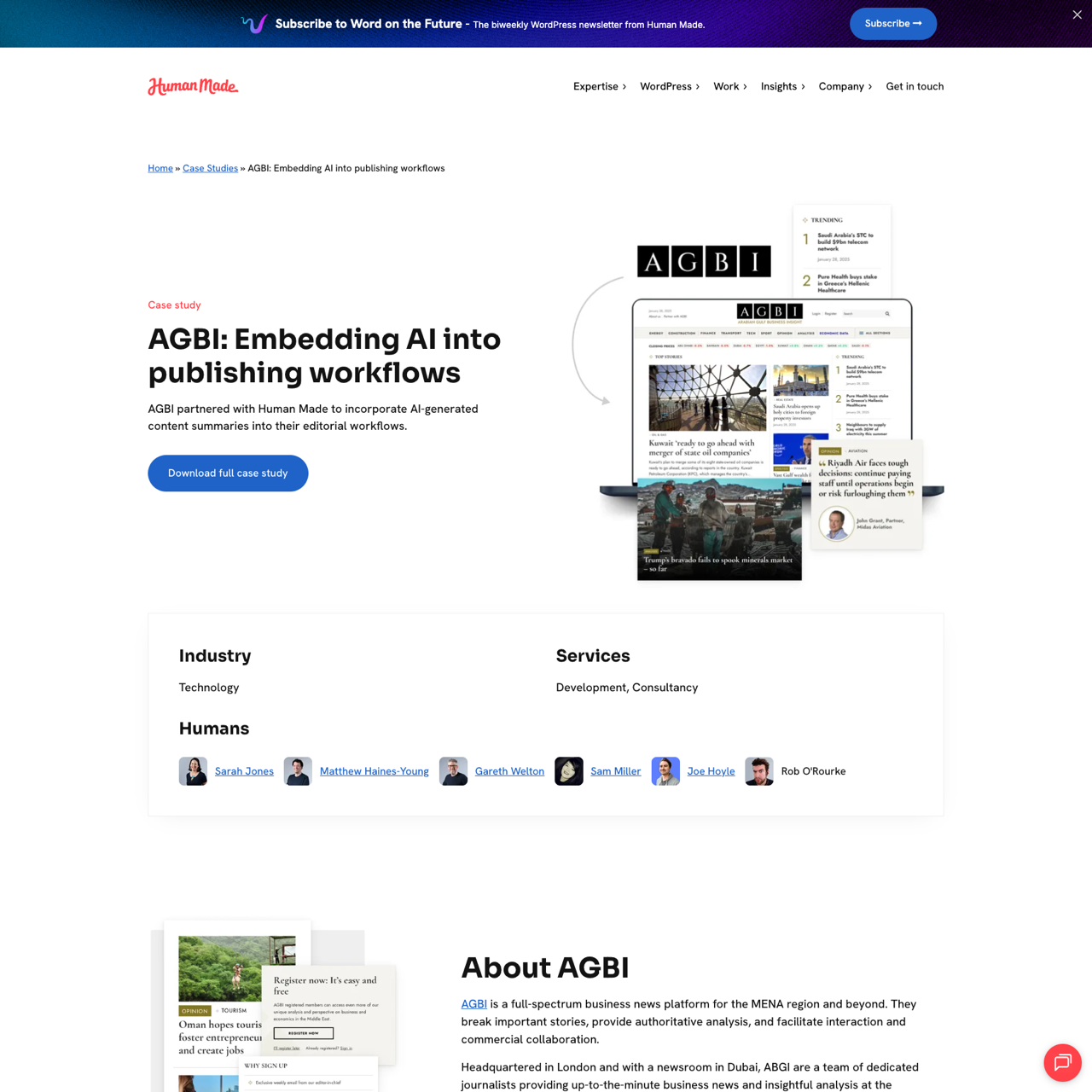 AGBI partnered with Human Made to integrate AI-generated content summaries into their editorial workflows, aiming to enhance efficiency and deliver impactful insights. The project focused on refining AI prompts to produce publish-ready summaries, overcoming limitations in generating contextually relevant content. By leveraging AI, AGBI streamlined their editorial process, enabling editors to generate, review, and publish summaries more efficiently. This approach not only improved productivity but also strengthened user engagement through enriched content experiences. The initiative resulted in a more dynamic and interactive editorial ecosystem, positioning AGBI as a leader in technology-driven news delivery. The implementation demonstrated the potential of AI to transform traditional content creation, offering a competitive edge in a rapidly evolving media landscape.