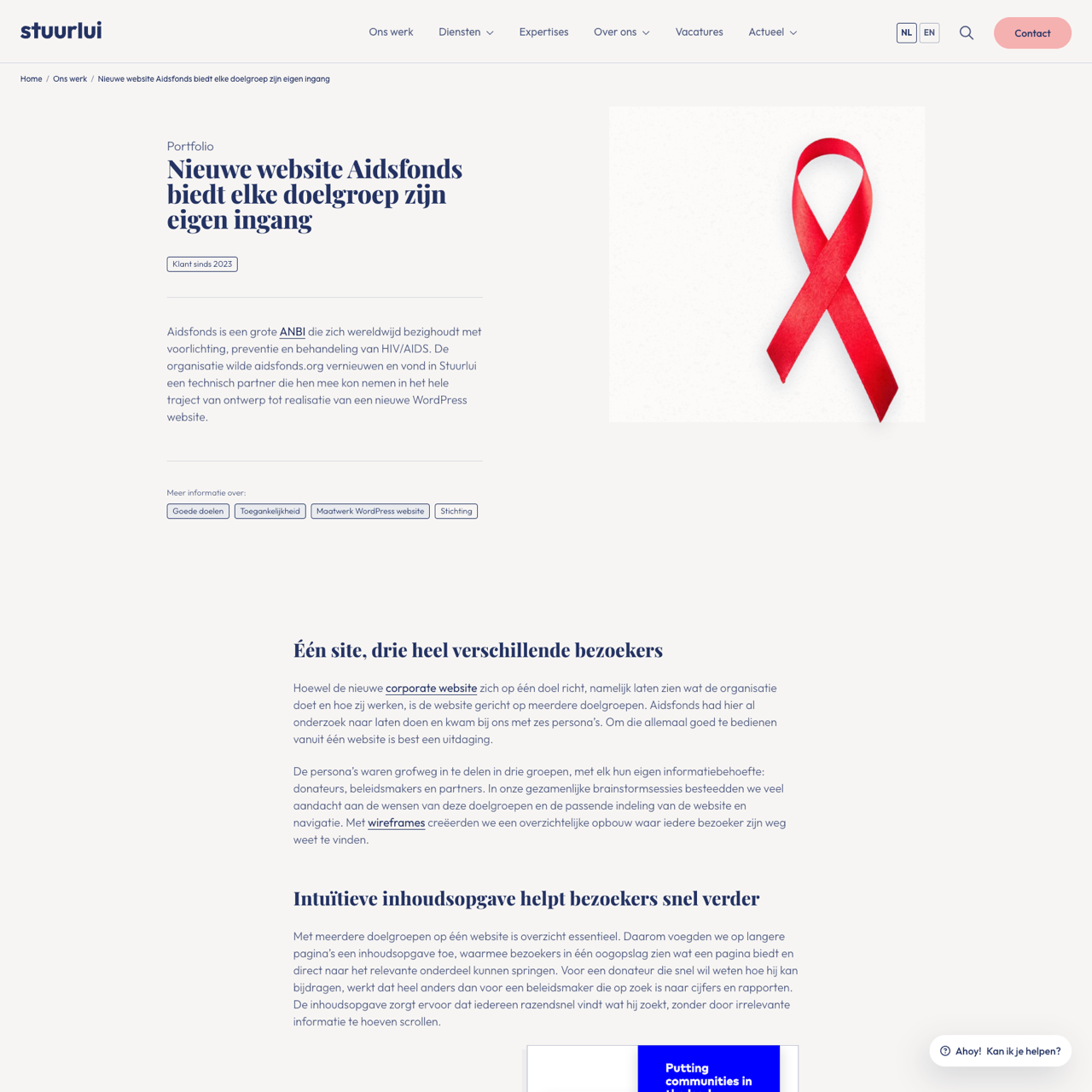 Aidsfonds partnered with Stuurlui to revamp their WordPress website, focusing on improving user experience for three key audiences: donors, policymakers, and partners. The redesign included wireframes and an enhanced navigation system to ensure clarity and efficiency. The homepage now provides essential context, highlighting the organization's mission and key statistics, while the content structure allows quick access to relevant information for each audience. The new design ensures that all users can find what they need efficiently, without scrolling through irrelevant content.
