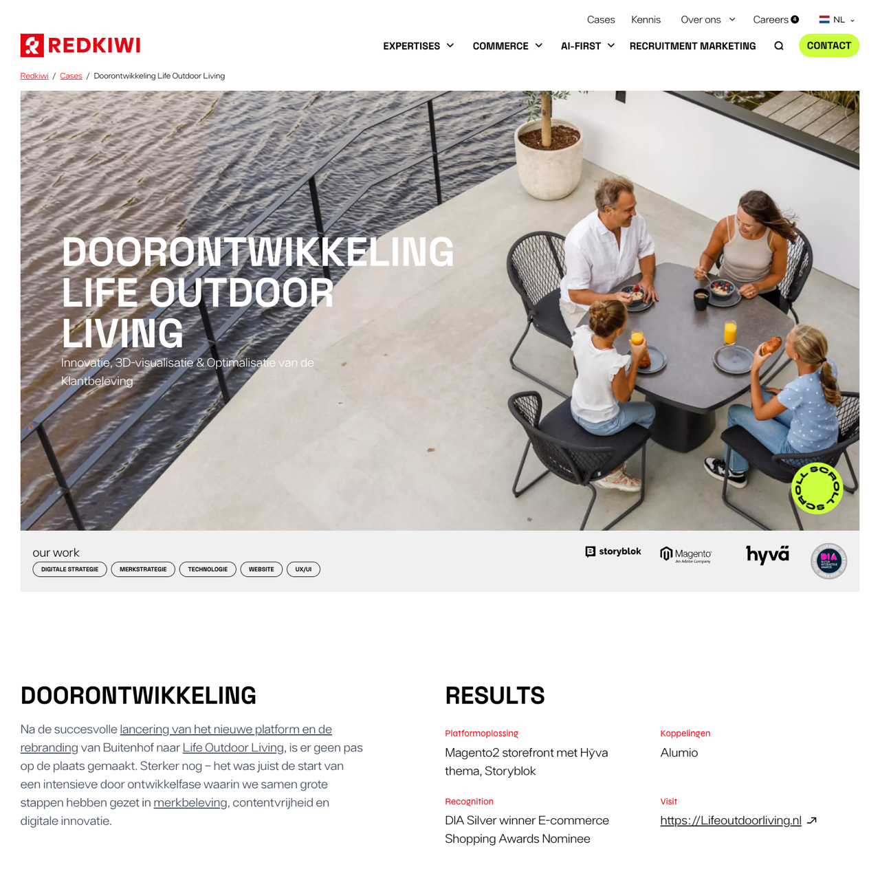 Alumio and Magento powered Life Outdoor Living's modern, premium website, enhancing brand identity and customer experience. The redesign focused on product-centric design, 3D visuals, and consistent storytelling, aligning with the brand's premium positioning. The platform's flexibility and advanced rendering capabilities enabled dynamic content management and immersive product showcases, resulting in a 3D visual experience that outperformed competitors in the Benelux. The project was recognized as a DIA Silver winner in the E-commerce Shopping Awards.