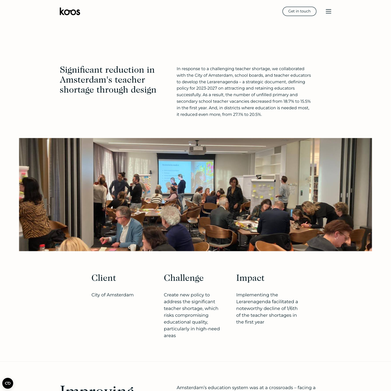 The City of Amsterdam faced a severe teacher shortage, impacting high-need areas. Through collaborative policy-making, Koos supported the development of the Lerarenagenda, which included targeted incentives and support systems. This initiative led to a 16% reduction in teacher shortages within the first year. The Lerarenagenda emphasized the role of strong school leaders, ensuring sustainable recruitment and retention. Key policies, such as enhanced support for educators and strategic planning, were central to the success. The city's commitment to addressing the shortage through innovative, stakeholder-driven approaches resulted in measurable improvements in educational quality and equity. The Lerarenagenda was designed with a user-centered approach, aligning with the needs of educators and policymakers. By focusing on systemic solutions, the city achieved a significant reduction in teacher shortages, demonstrating the effectiveness of collaborative policy-making in addressing complex educational challenges.