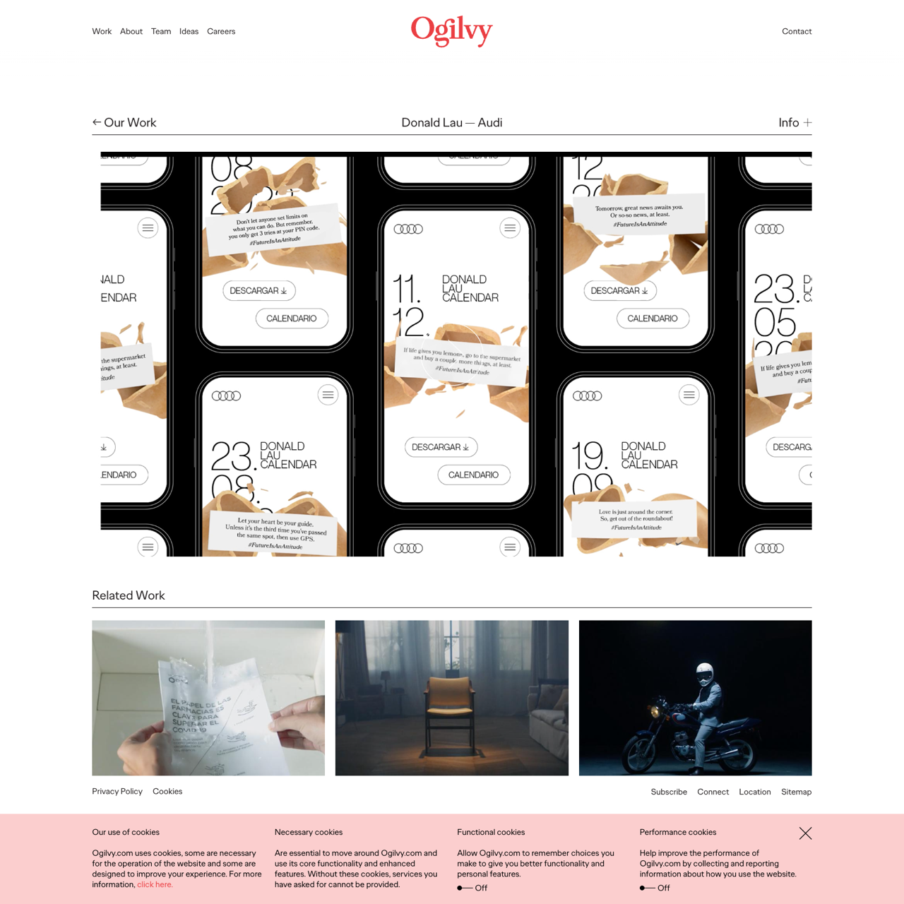 Audi partnered with Ogilvy Barcelona to leverage a Loyalty CRM program and the fortune cookie as a medium to communicate its 'Future is An Attitude' positioning. Donald Lau, a retired writer, was invited to craft 365 fortune cookies that Audi transformed into a cross-platform calendar. The campaign highlighted how a small, personal touch could convey a bold brand message. The result was a resonant, emotionally engaging experience that aligned with Audi's vision of the future as an attitude. The initiative demonstrated that even limited platforms can drive meaningful impact when paired with a compelling narrative.