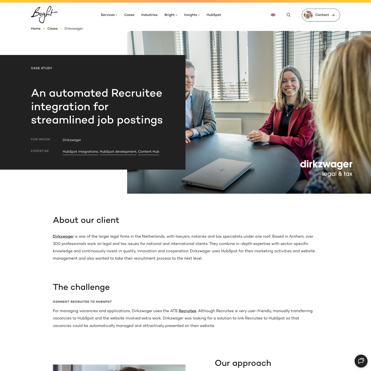 Dirkzwager, a leading legal firm in the Netherlands, faced challenges in managing job postings and applications by manually transferring data between Recruitee and their HubSpot website. To streamline this process, Bright Digital developed a custom integration that automatically synchronizes vacancies, updates, and expired listings between the two platforms. The solution eliminates manual work, ensuring candidates can apply directly through the HubSpot website. By integrating Recruitee with HubSpot, Dirkzwager achieved faster, more accurate candidate management and improved user experience. The integration also includes smart segmentation to organize job details neatly, reducing the need for recruiters to manually adjust content. This automated system significantly提升了 efficiency and reduced administrative overhead for Dirkzwager's recruitment team.