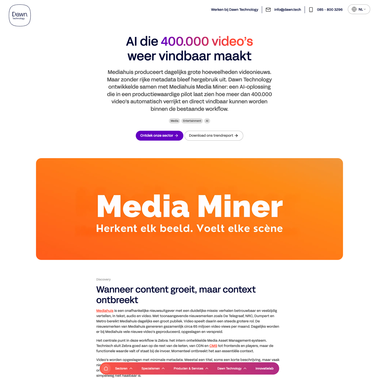 Mediahuis faced challenges with untagged video assets, leading to inefficiencies in content discovery and production. Dawn Technology developed a solution that automatically enriches video metadata, integrating seamlessly with existing workflows. The system adds relevant tags, descriptions, and context without requiring manual intervention, improving searchability and reducing the need for external tools. This automated approach ensures that Mediahuis can continue its mission of delivering reliable, diverse content without compromising efficiency or quality.