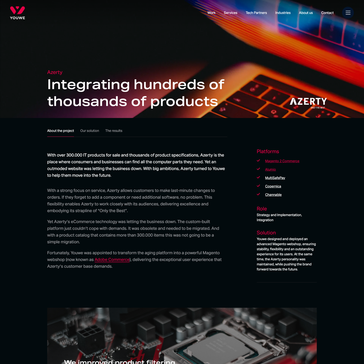 Azerty faced challenges with an outdated eCommerce platform that struggled to handle 300k+ products and complex search demands. Youwe transformed the legacy system into a modern Magento (Adobe Commerce) platform, enhancing product filtering and user experience. By leveraging Elasticsearch, the team improved search capabilities and added features like product icons, USPs, and SKU badges to drive conversions. The result was a streamlined, intuitive platform that delivered the exceptional experience Azerty's customers expected, embodying its strapline of 'Only the Best.'