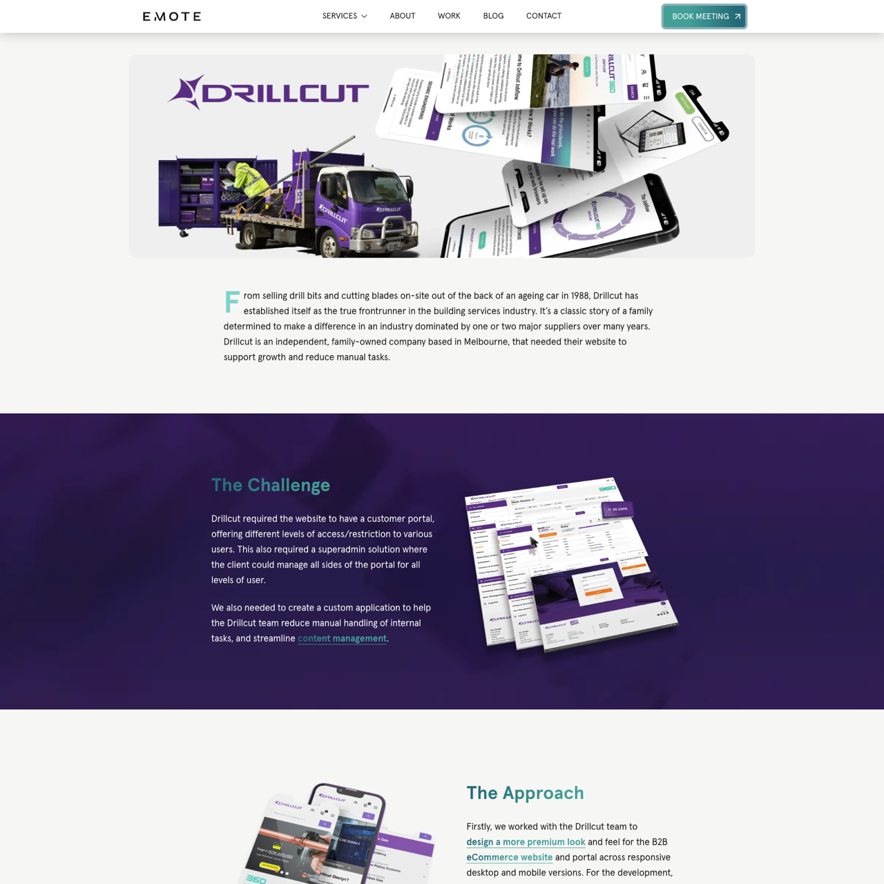 Drillcut needed a customer portal and superadmin solution to streamline internal tasks and improve customer satisfaction. Emote Digital designed a responsive Shopify Plus website with Algolia Search, integrating MYOB EXO for seamless payments and 8×8 Online Chat. The result was a streamlined platform reducing manual handling and boosting conversion rates. The site featured a premium experience with advanced search and user access controls, enhancing efficiency and customer engagement.