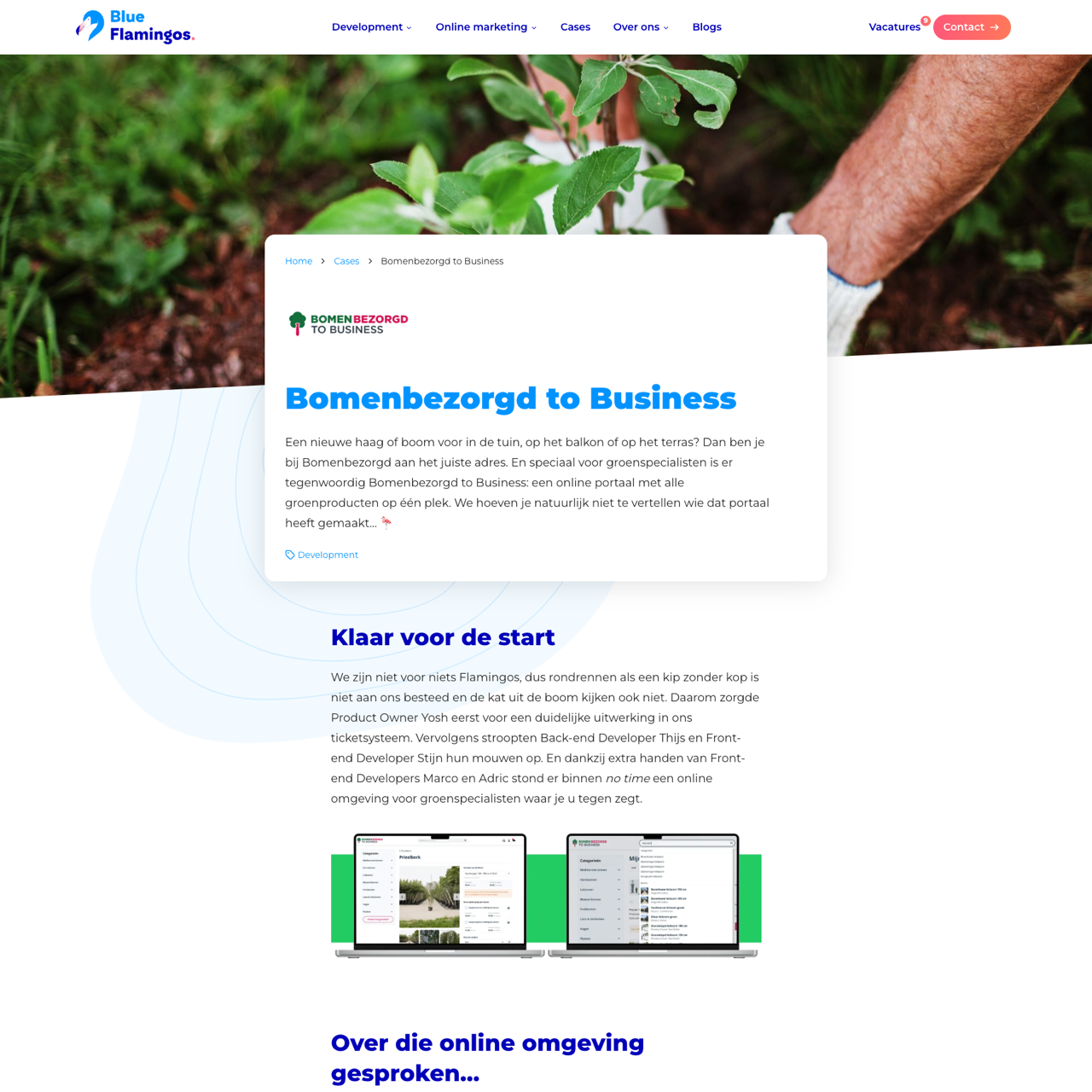 Bomenbezorgd to Business is a multifunctional platform designed for gardeners, enabling them to access all green products in one place. Through collaboration with Blue Flamingos, the platform was developed to streamline the process of ordering and managing plantings. Gardeners can search, categorize, and order plants with ease, even creating custom products and offering them through the platform. The solution significantly improved efficiency and convenience for professionals in the green industry. The platform's features, such as real-time order tracking and customizable offerings, have made it a valuable tool for gardeners looking to expand their services.