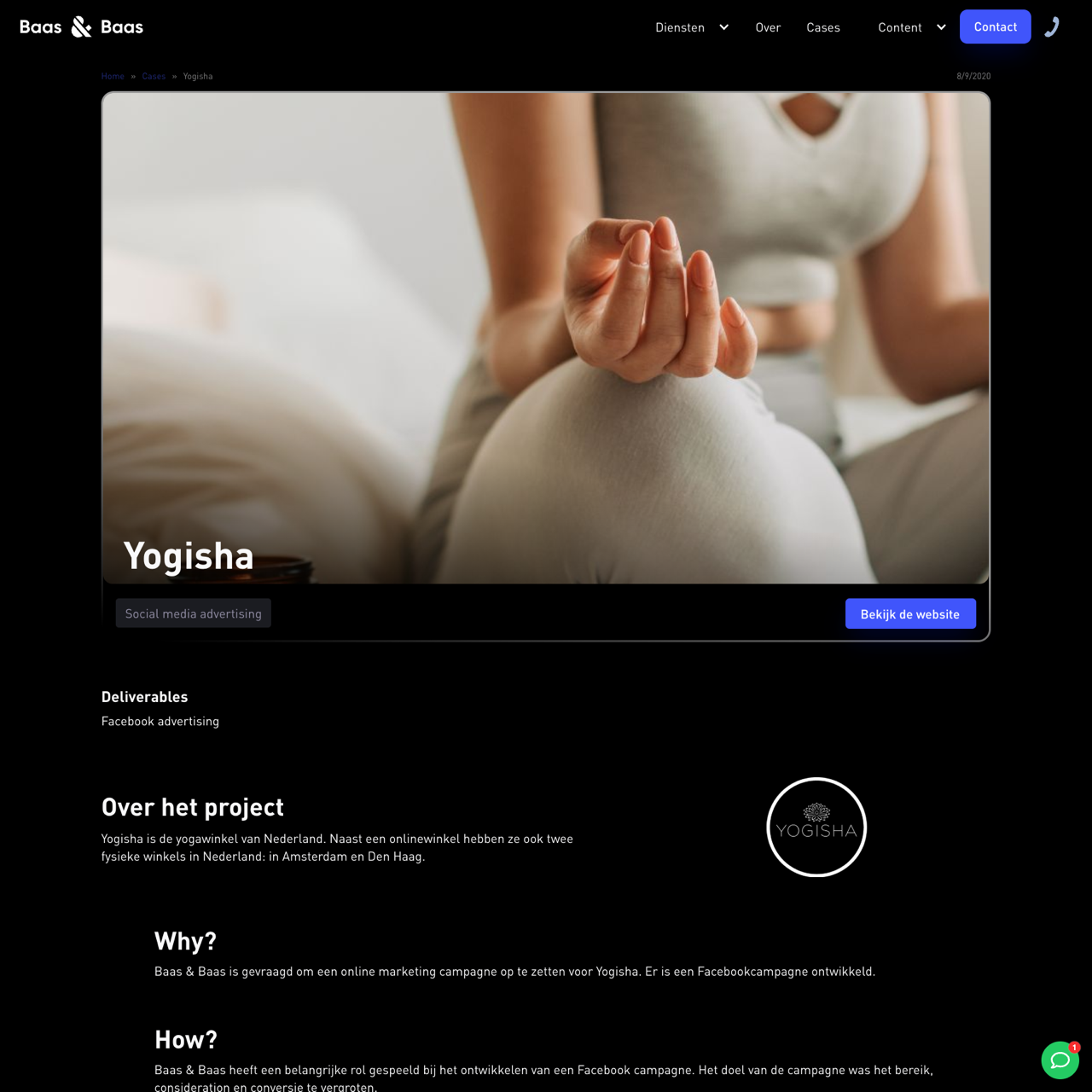 Baas & Baas helped Yogisha elevate their online presence through targeted Facebook advertising, driving increased engagement and conversion rates. The campaign successfully captured the attention of potential customers, leading to a notable rise in brand awareness and traffic. By leveraging Facebook's powerful targeting capabilities, Yogisha was able to reach their ideal audience effectively, resulting in a measurable increase in website traffic and customer inquiries. The campaign's success highlights the effectiveness of strategic Facebook advertising in boosting brand visibility and driving business growth.