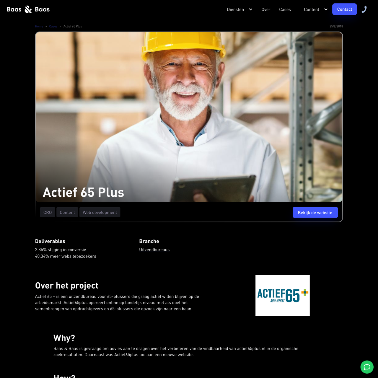 Baas & Baas optimized Actief 65 Plus's online presence through SEO strategies, resulting in a 2.85% conversion rate and 40.34 million page views. The platform saw a significant increase in organic search traffic and engagement, with Facebook fans growing to 1.898. The campaign focused on improving visibility in Google through website optimization and linkbuilding, while also launching a new website for the brand. The results demonstrate the effectiveness of a tailored SEO approach tailored to the brand's goals and platform capabilities.