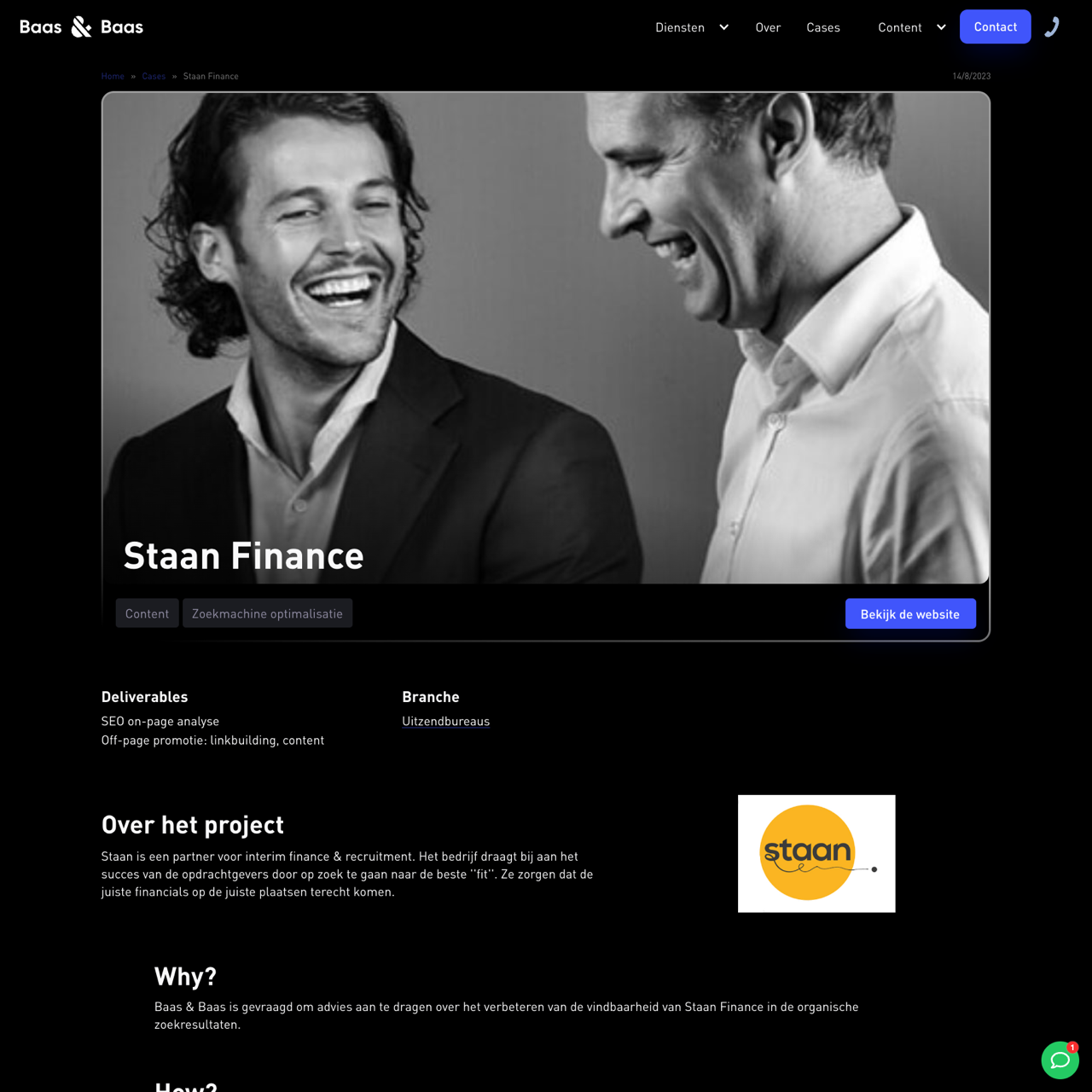 Baas & Baas optimized Staan Finance's Google visibility through comprehensive SEO on-page analysis and strategic linkbuilding. The agency provided on-page advice and enhanced off-page visibility through content creation and backlink strategies. The result was a significant improvement in search engine rankings, making Staan Finance more discoverable in organic search results. The success was achieved through strong collaboration with the client and effective digital marketing tactics.