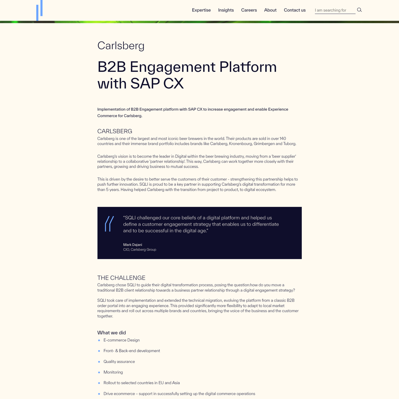 Carlsberg partnered with SQLI to transform their B2B engagement platform using SAP CX, enabling flexible and scalable solutions for a global market. The project focused on bridging traditional client relationships with a collaborative partner model, ensuring adaptability across multiple brands and regions. Through comprehensive e-commerce design, development, and operations, Carlsberg achieved a unified digital ecosystem that supports local market needs and drives innovation. The initiative successfully enhanced engagement, scalability, and future readiness, positioning Carlsberg as a leader in digital transformation within the beer industry.