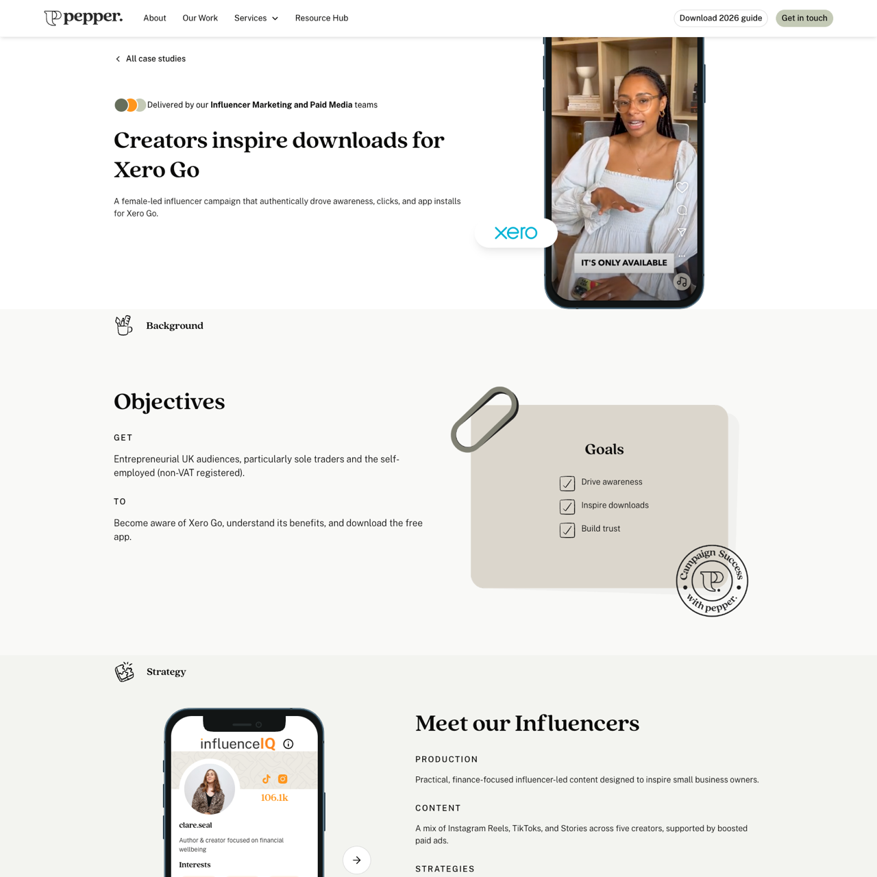 This campaign leveraged five female-led influencers—clare.seal, yasminecamilla, charlottesevensix, helpsavemoney, and others—to drive awareness and downloads of Xero Go. By blending organic storytelling with paid amplification, the strategy positioned the app as a practical tool for self-employed audiences. The campaign achieved 106.1k downloads across Instagram and TikTok, showcasing authentic content that built trust and engagement. The approach focused on relatable, finance-focused storytelling, aligning with the brands' interests in budgeting, lifestyle, and business insights. The result was a successful digital campaign that resonated with the target audience, demonstrating the power of influencer-led content in driving app downloads.
