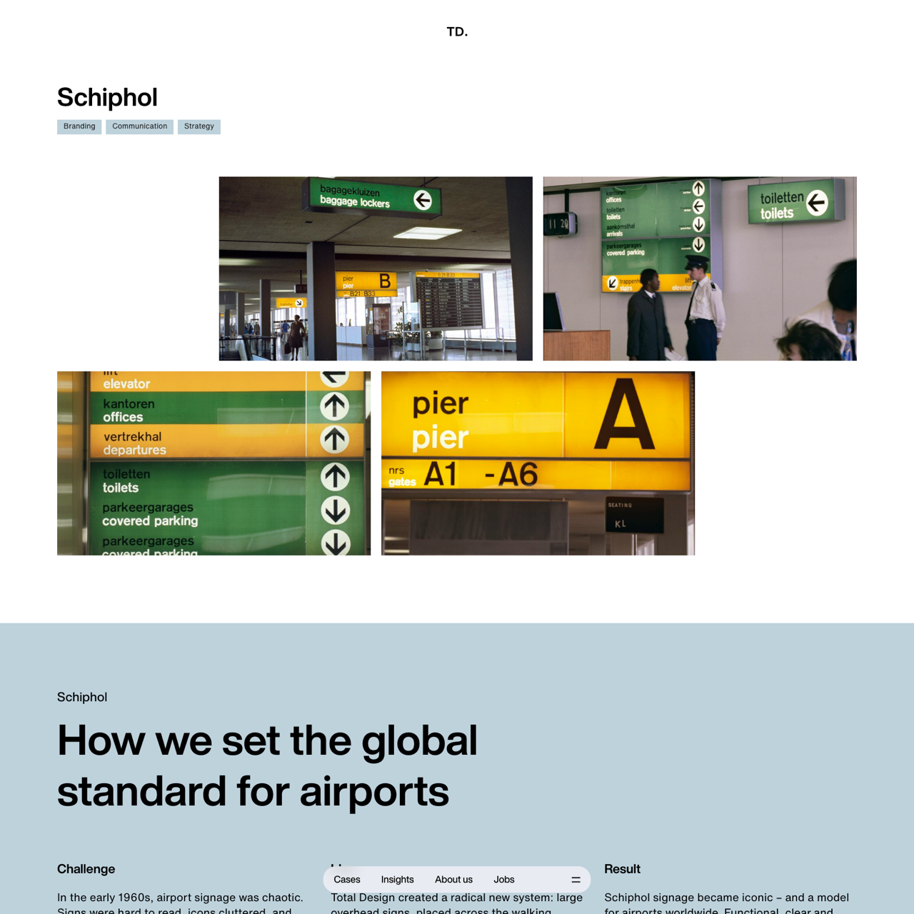 Schiphol's iconic signage revolution began in the 1960s when Total Design introduced a radical system of large overhead signs, using yellow for main routes and green for secondary information. The solution featured clean, functional typography—Akzidenz Grotesk—ensuring readability from a distance. This approach transformed airport navigation, setting a global standard for clarity and simplicity. Decades later, Schiphol updated its signage with pictograms and Frutiger typeface, preserving the core principle of guiding travelers with precision and ease. The result was a timeless, functional design that continues to shape airport navigation today. "Schiphol’s wayfinding by Total Design shows how clarity endures—design as function, not ornament."