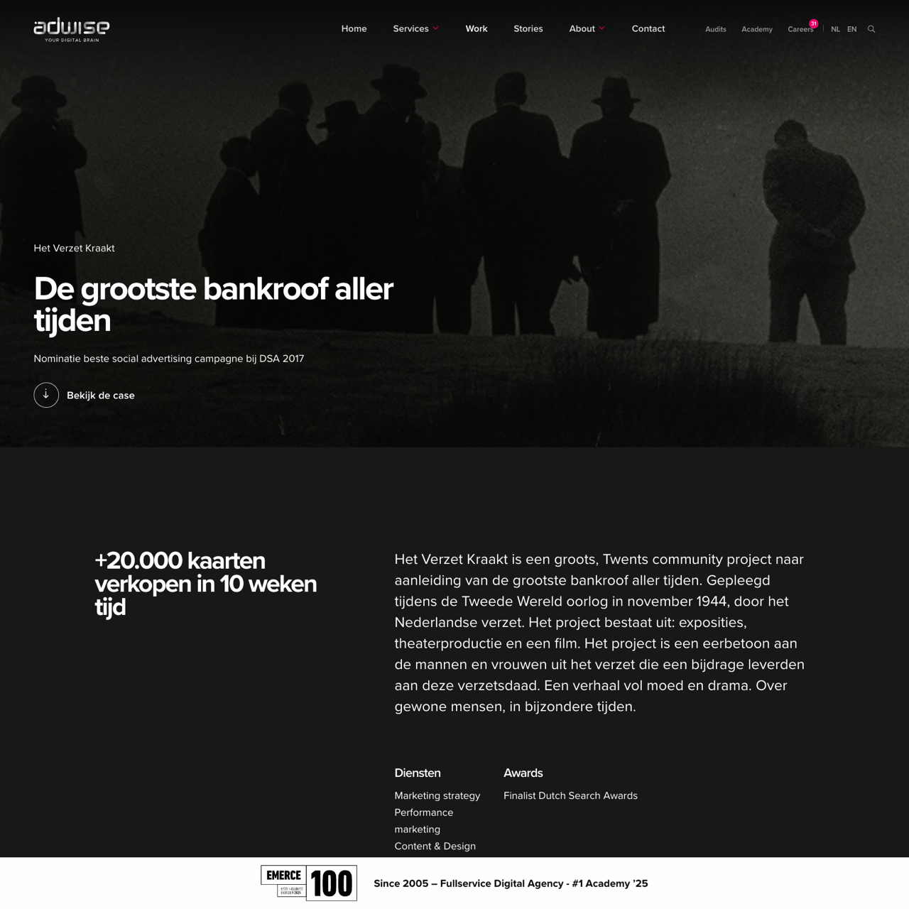 This community-driven project honors the Dutch resistance during WWII, showcasing the largest bank robbery of all time through exhibitions, theater, and a film. It highlights the courage of ordinary people in extraordinary times, blending drama with historical context. The campaign leveraged regional Facebook carrousel promotions and local events, including print, radio, and billboards, to engage the public. Video portraits of participants and behind-the-scenes stories were shared to deepen the narrative, creating a compelling visual and emotional journey. The initiative aimed to educate and inspire reflection on the resilience of the resistance movement.