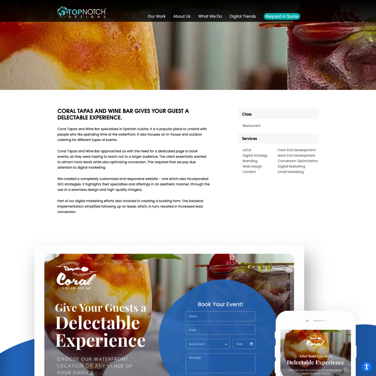 Coral Tapas and Wine Bar sought to expand their event booking capabilities and attract more leads by creating a dedicated event page. Top Notch Dezigns designed a custom, responsive website with SEO optimization, highlighting their specialties and offering a seamless booking experience. The solution included a dynamic booking form that simplified lead follow-up, driving higher conversion rates. The website's user-friendly design and aesthetic appeal received positive feedback from customers, who praised its effectiveness in enhancing engagement and visibility. The project demonstrated the power of strategic digital marketing in boosting lead generation and conversion for a local restaurant business.