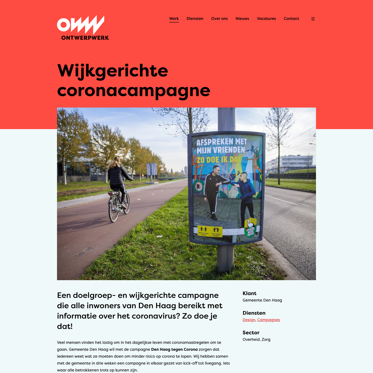 This case study highlights Den Haag tegen Corona, a targeted coronavirus campaign designed by Ontwerpwerk to reach all residents of Den Haag with essential information. The initiative, launched in three weeks, combines local role models and practical examples to educate citizens on pandemic precautions. Through accessible design, the campaign uses multilingual posters and materials to ensure inclusivity across all neighborhoods. The project successfully engaged diverse communities by leveraging recognizable local figures and clear instructions, demonstrating the power of localized communication. The campaign's success lies in its ability to blend practical advice with cultural relevance, making it a model for community-driven public health efforts.