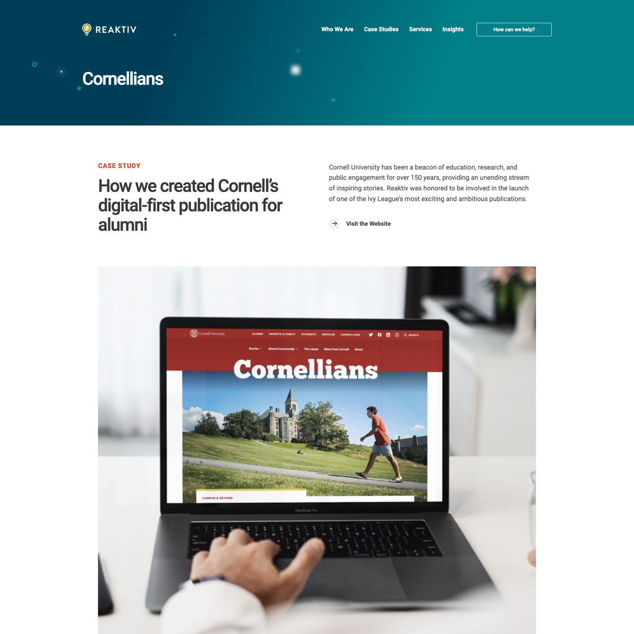Reaktiv collaborated with Cornell University to create a digital-first publication for its alumni, aiming to unify the experience across print and digital platforms. The project leveraged user research and a strong existing relationship with Reaktiv, resulting in a cohesive digital hub that connects Cornell alumni, parents, and friends. By focusing on accessibility and engagement, the platform successfully expanded Cornell’s reach and provided a more personalized experience for its community. The initiative highlighted Reaktiv’s ability to innovate and adapt, ensuring that Cornell’s legacy and values were preserved in a modern, interactive format.