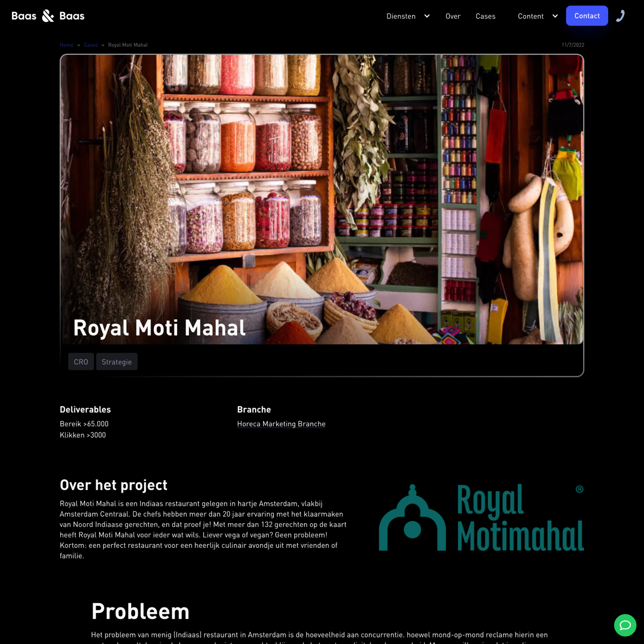 Royal Moti Mahal, an Indian restaurant in Amsterdam, faced intense competition and needed to enhance its online presence. Baas & Baas helped launch Meta campaigns and manage Instagram content to increase visibility and drive website traffic. The strategy resulted in over 10,000 new followers and 3,000 clicks on the website, significantly boosting digital exposure and customer engagement.