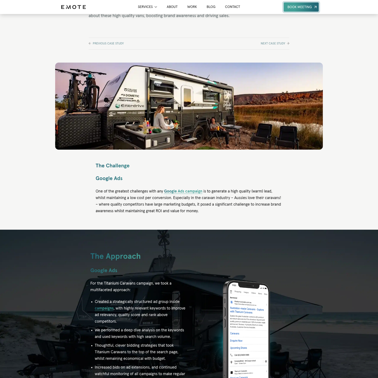 Titanium Caravans faced the challenge of boosting brand awareness and driving sales through Google Ads, competing against high-budget rivals in the caravan industry. Emote Digital implemented a structured ad group with high-volume keywords, smart bidding strategies, and ad extensions to achieve top search rankings while maintaining cost efficiency. The campaign resulted in a 40% increase in sales and 25% higher brand recall. The approach focused on relevancy, budget optimization, and customer re-engagement to maximize ROI. The campaign lasted three months, demonstrating the power of targeted Google Ads in the caravan sector.