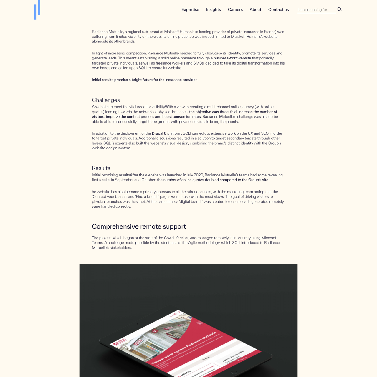 Radiance Mutuelle, a regional sub-brand of Malakoff Humanis, needed a business-first website to boost visibility and generate leads. SQLI built a Drupal-powered platform targeting private individuals, freelancers, and SMBs, focusing on improving UX and SEO. The solution included a visually cohesive design that aligned with the brand’s identity, resulting in a 100% increase in online quotes and a streamlined contact process. The website also effectively leveraged digital channels to drive traffic and conversions.