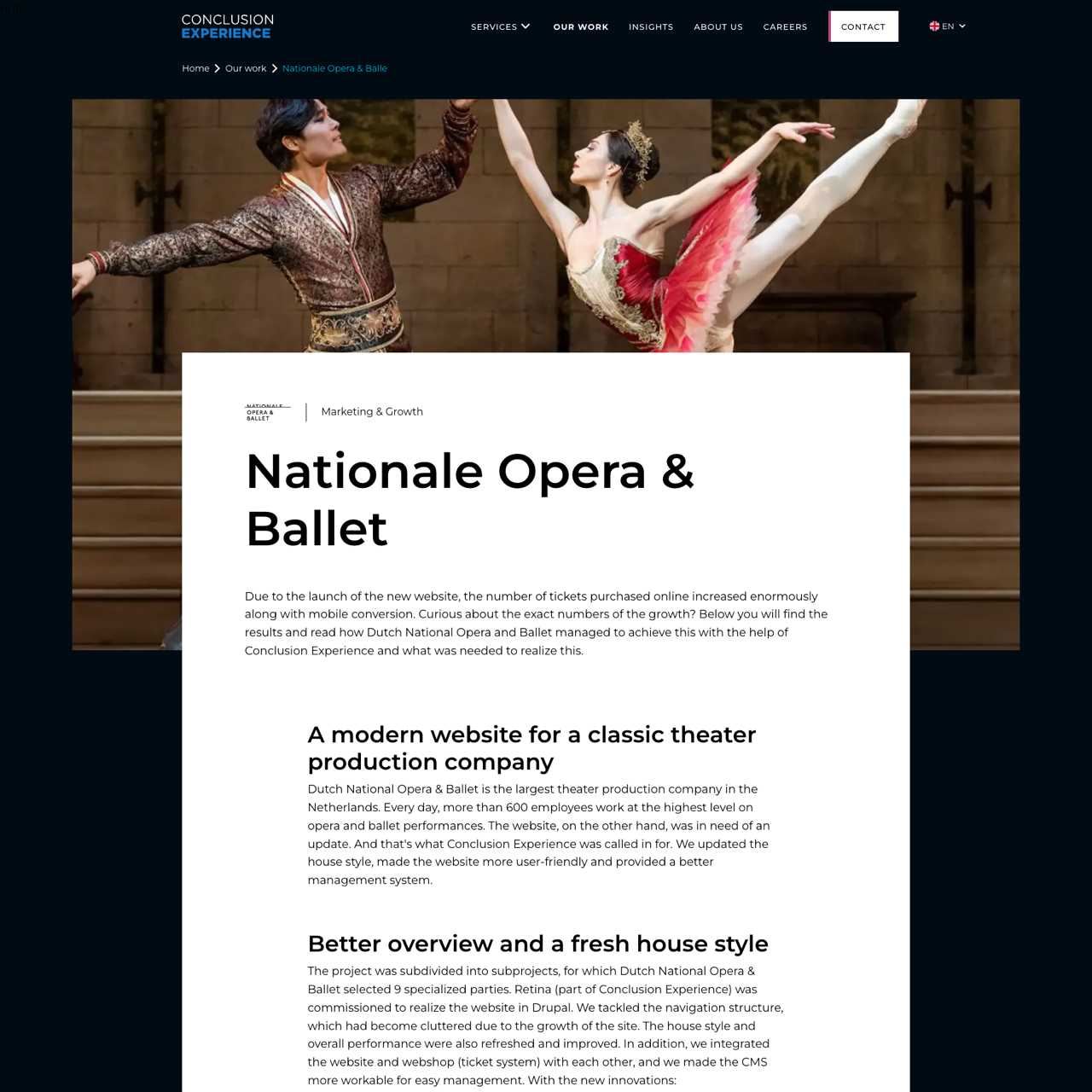 Conclusion Experience modernized Dutch National Opera & Ballet's Drupal-based website, improving navigation, user experience, and visual design. The project streamlined the site's structure, integrated the webshop, and enhanced CMS functionality, resulting in a more intuitive and visually appealing platform. Key improvements included a clearer navigation system, a more attractive house style, and a smoother user experience, with measurable gains in ticket sales and customer engagement. The updated site now offers a more efficient and visually appealing experience for both employees and users, saving time and enhancing operational efficiency.
