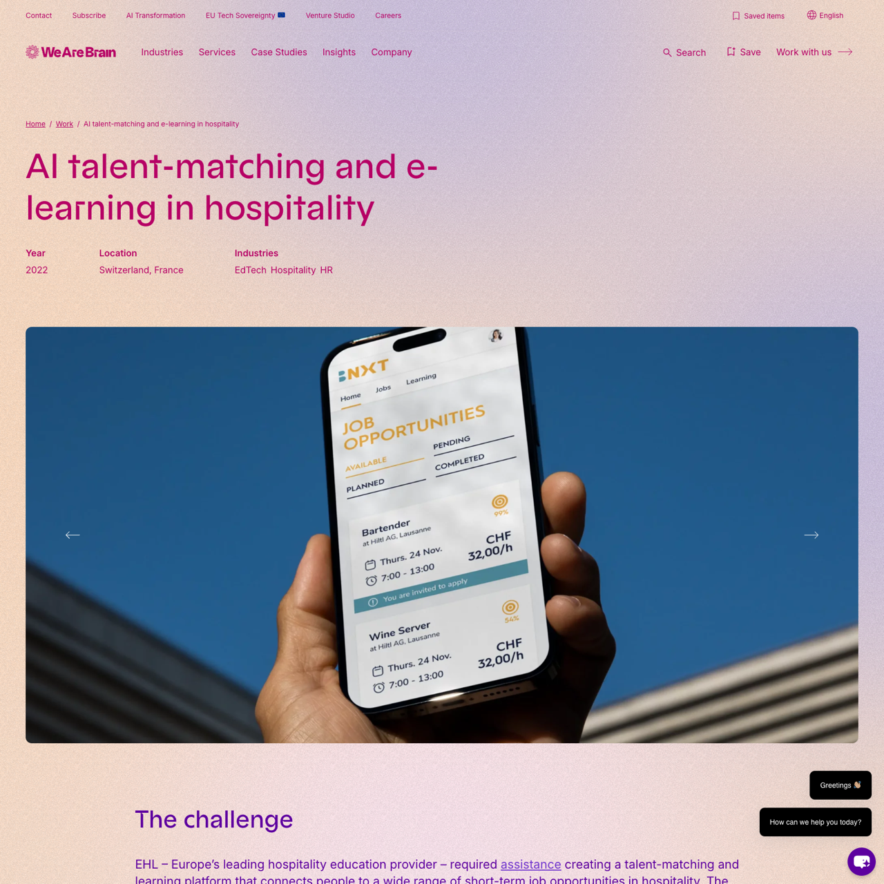 EHL's innovative talent-matching platform for hospitality connects individuals to short-term job opportunities through a blended learning ecosystem. The solution combines educational solutions with assessments, offering customizable training modules and intelligent matching tools to enhance workforce development. By integrating talent marketplaces with lifelong learning, the platform empowers employers to fast-track recruitment and upskill their teams. In 2022, the platform was launched in June, expanded with new releases, and enhanced HR tools to support talent acquisition and workforce development. The initiative delivered a positive impact, enabling businesses to efficiently connect skilled professionals with opportunities in the hospitality sector.