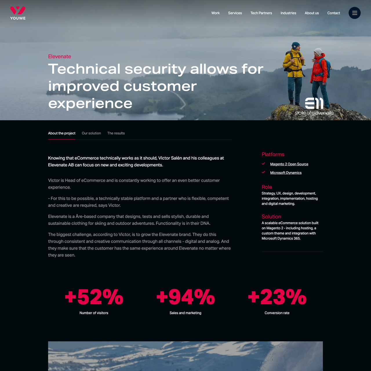 Elevenate, a Stockholm-based company specializing in sustainable outdoor clothing, faces the challenge of expanding its brand through consistent, creative communication across all channels. Their success hinges on a technically stable platform and a partner that offers flexibility, competence, and innovation. By collaborating with Youwe, Elevenate transitioned from a WordPress/WooCommerce setup to a custom eCommerce solution, achieving a 52% increase in visitors and a 23% rise in sales. Youwe’s tailored approach, starting from the customer’s unique needs, enabled the development of a Magento 2-based platform that seamlessly integrated Elevenate’s branding and functionality. The partnership highlights the importance of a scalable, adaptable solution in driving growth and customer experience. The solution’s flexibility and creative capabilities allowed Elevenate to build a robust foundation for future expansion.