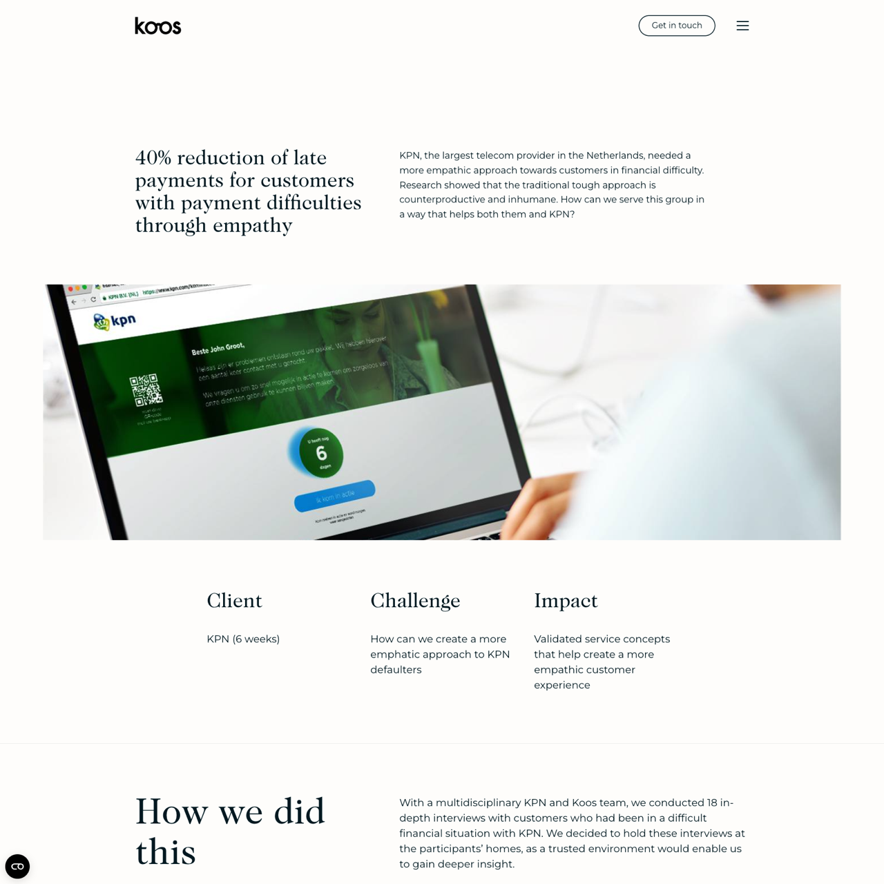 KPN's financially struggling customers were deeply interviewed to uncover their unique needs and behaviors. Koos developed need-based personas and prototyped service concepts that addressed their challenges, leading to a redesigned process and new tools like a debt repayment app and customer service specialization. These innovations enhanced KPN's empathic approach, offering tailored solutions and improved communication. The project transformed KPN's customer experience by prioritizing understanding and support for those facing financial difficulties.