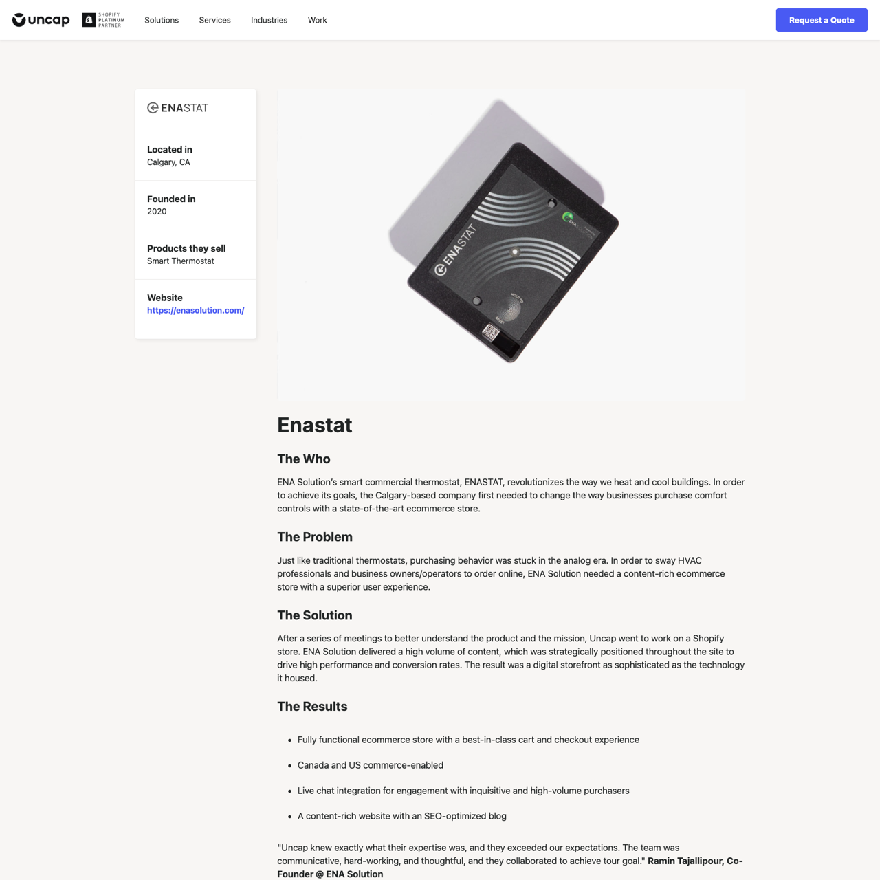 ENa Solution's Shopify store revolutionized the way businesses purchase smart thermostats by offering a high-performance, content-rich platform. Uncap designed a digital storefront that matched the sophistication of the technology it housed, featuring a best-in-class cart and checkout experience. The result was a seamless, user-friendly platform that boosted conversion rates and engagement. The store was fully functional, enabled commerce in Canada and the US, and included live chat for customer interaction. Ramin Tajallipour, Co-Founder at ENA Solution, praised the team's expertise and ability to deliver a solution that exceeded expectations.