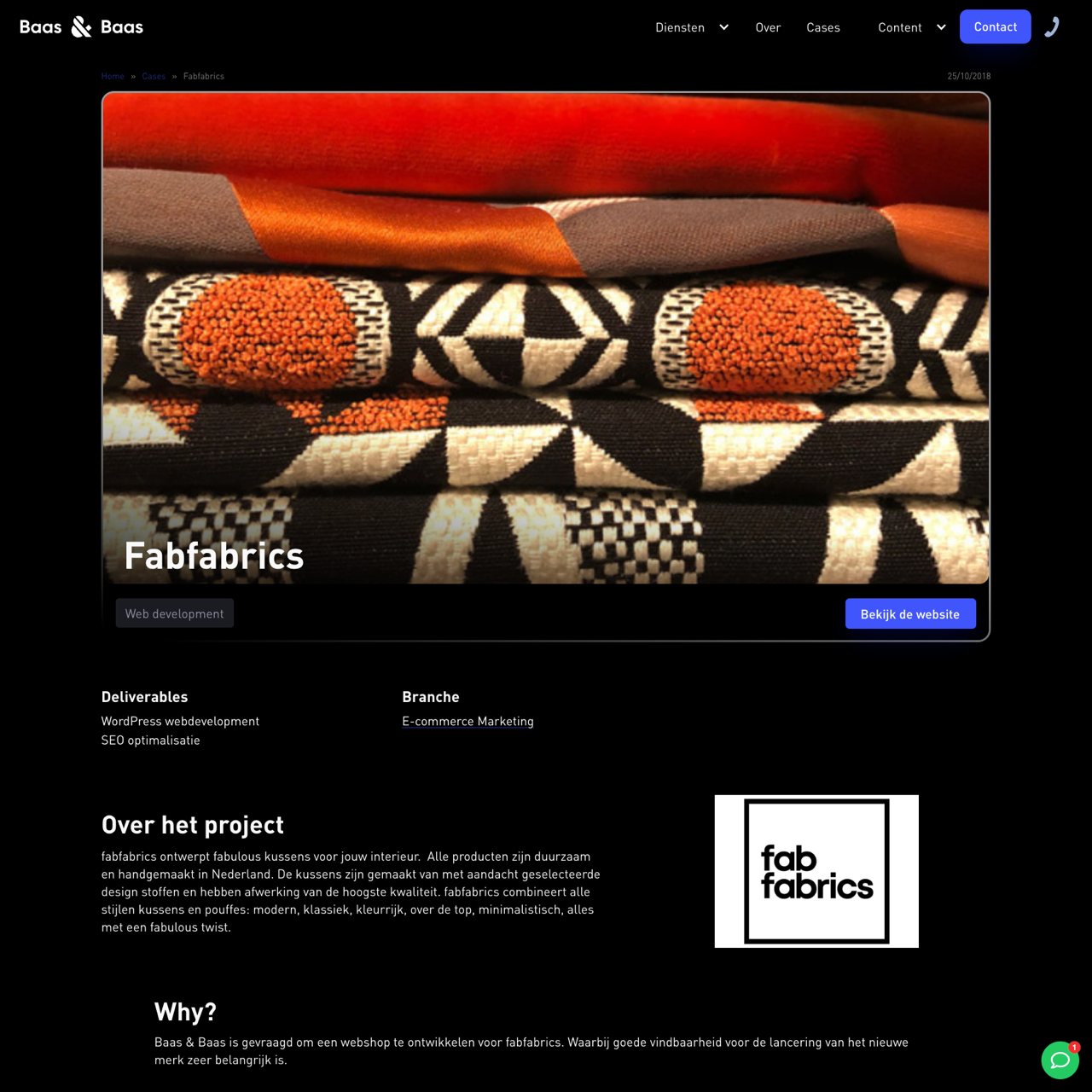 Baas & Baas developed a WordPress webshop for Fabfabrics, focusing on a modern design that reflects the brand's fabulous cushions. The platform was optimized for search engines, ensuring high visibility in Google. The result is a visually appealing and highly search-engine-optimized website that showcases Fabfabrics' commitment to quality and design. The webshop effectively highlights the brand's dedication to sustainable, handcrafted products, providing a seamless experience for customers looking for fashionable interior furnishings.