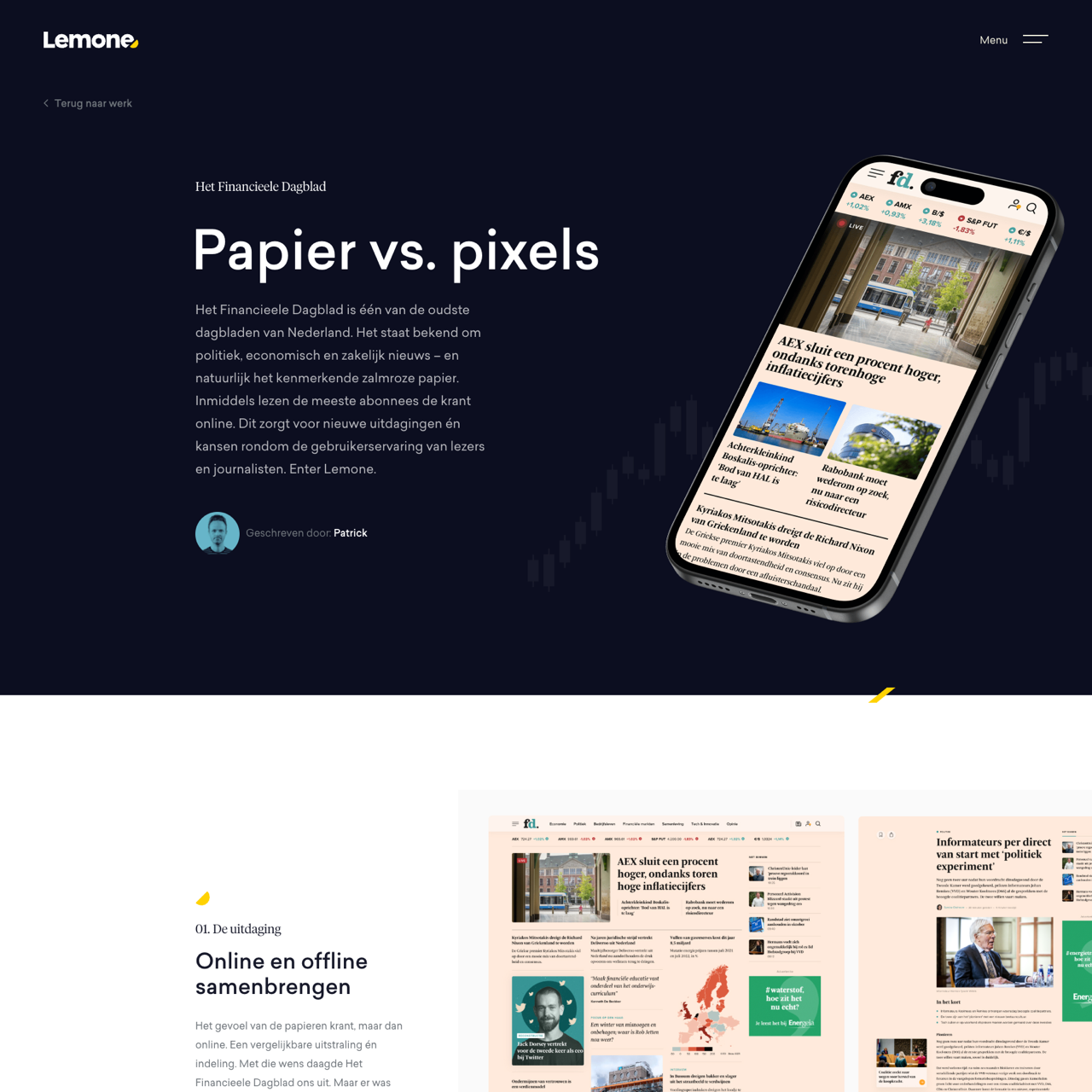 The Financial Times Digital (FD) sought to maintain its iconic zalmroze print aesthetic while adapting to online consumption. Lemone designed a clean, responsive layout with consistent branding, incorporating a dark mode and a unified style guide. The redesign enhanced user experience by improving article structure, typography, and visual hierarchy, ensuring a seamless transition between print and digital formats. The new homepage features varied article layouts, thematic sections like 'podcast' and 'opinie,' and prioritizes the most relevant content for readers. The project successfully balanced aesthetic appeal with functional usability, maintaining the FD's brand identity across all platforms.