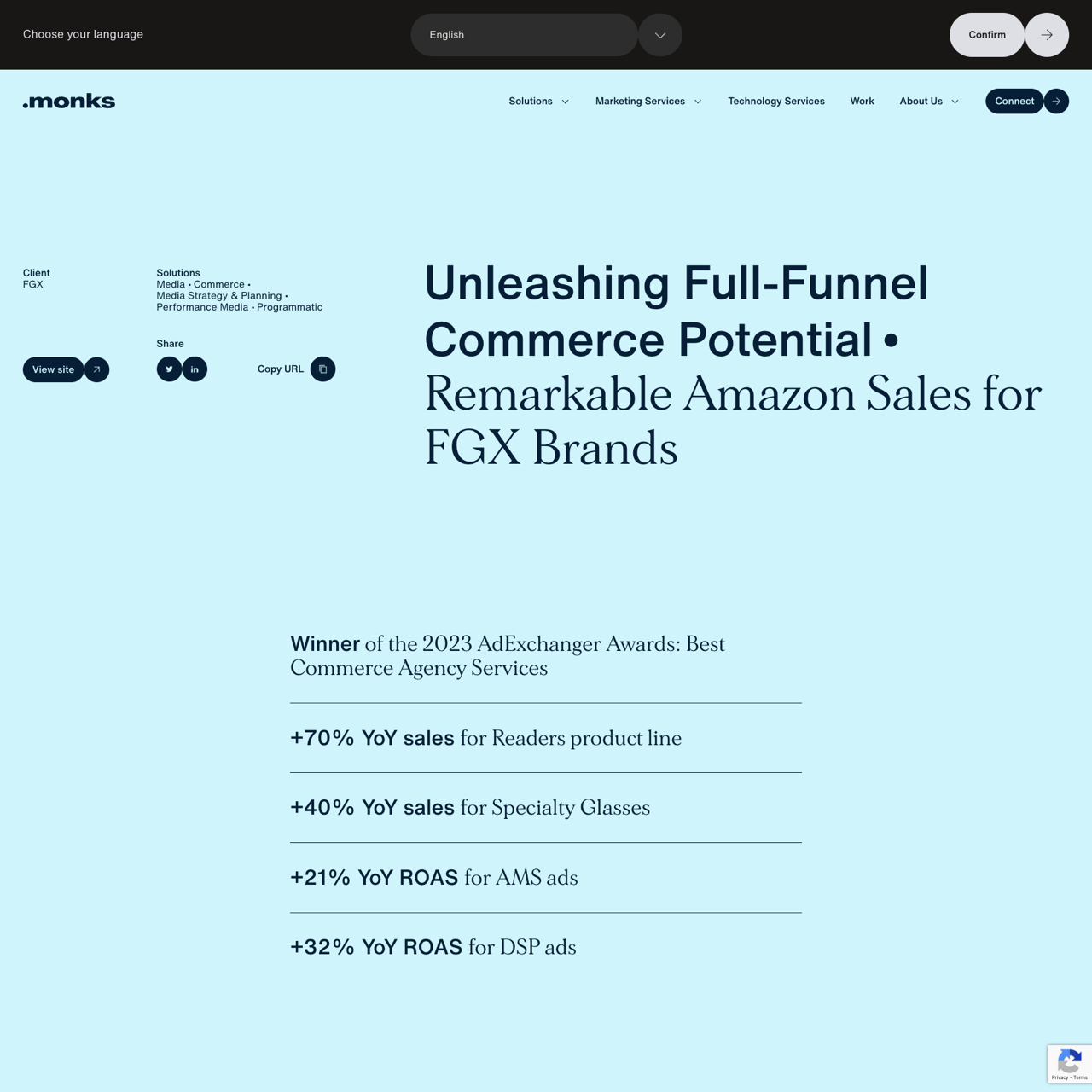 FGX, a leading global designer of readers and sunglasses, faced intense competition on Amazon, achieving a 70% YoY sales increase for its Readers product line and a 40% YoY growth for Specialty Glasses. Monks optimized a multi-faceted commerce strategy, leveraging Sponsored Brand campaigns and consistent Amazon Posts to drive brand awareness and engagement. The campaign successfully increased Brand Store followers by 300% and boosted ROAS by 32% for DSP ads. By aligning with FGX’s brand portfolio, Monks helped maximize portfolio-level results across the full funnel. The success highlights the effectiveness of targeted advertising and strategic brand engagement on Amazon.
