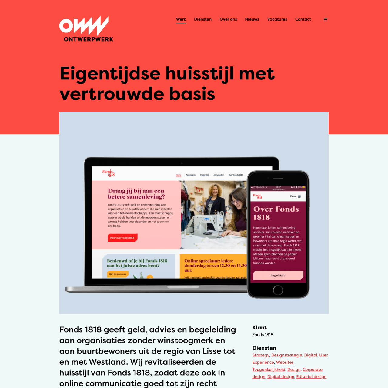 Fonds 1818 revitalized its house style for online presence, modernizing its logo and expanding its visual identity with a cohesive color palette and distinctive design elements. The project enhanced the brand's recognition across digital platforms while maintaining its heritage-inspired aesthetic. The redesign included a modernized logo, accessible red color scheme, and a comprehensive visual identity system, ensuring the brand's values and history are preserved in digital formats. The new Drupal-based website was developed with a user-centered approach, offering a seamless experience for both applicants and staff. The project also aligned with the region's growth, positioning Fonds 1818 as a trusted community resource in Westland and the surrounding areas.