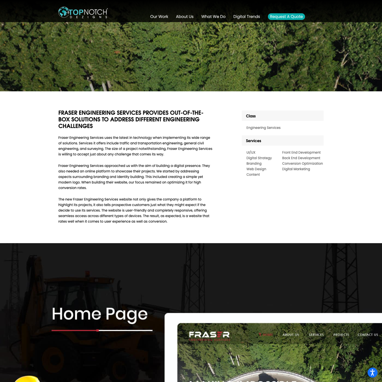 Fraser Engineering Services partnered with Top Notch Dezigns to revamp their digital presence, focusing on branding and conversion optimization. The project included creating a modern logo and a responsive website that highlights their expertise in traffic engineering, civil projects, and surveying. The new platform prioritizes user experience, offering seamless navigation across devices and high conversion rates. The result is a visually appealing site that effectively communicates Fraser Engineering Services' value proposition to potential clients. The website's design and functionality were tailored to meet industry standards, ensuring a strong online presence and measurable results.