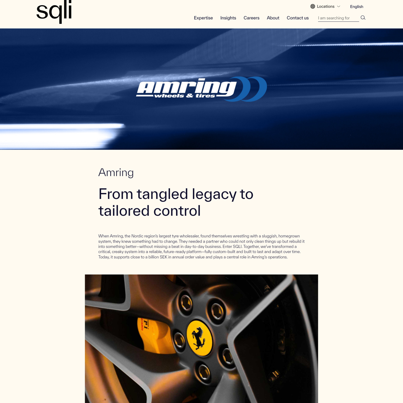 Amring, the Nordic region's largest tyre wholesaler, faced challenges with an outdated, sluggish system that hindered efficiency. SQLI rebuilt the platform step by step, creating a custom solution that integrated seamlessly with Global Automotive Group's systems. The new platform supports over a billion SEK in annual order value and centralizes critical operations. By stabilizing the existing solution while gradually implementing a new system, Amring achieved a reliable, future-ready platform that enhances operational efficiency and scalability.