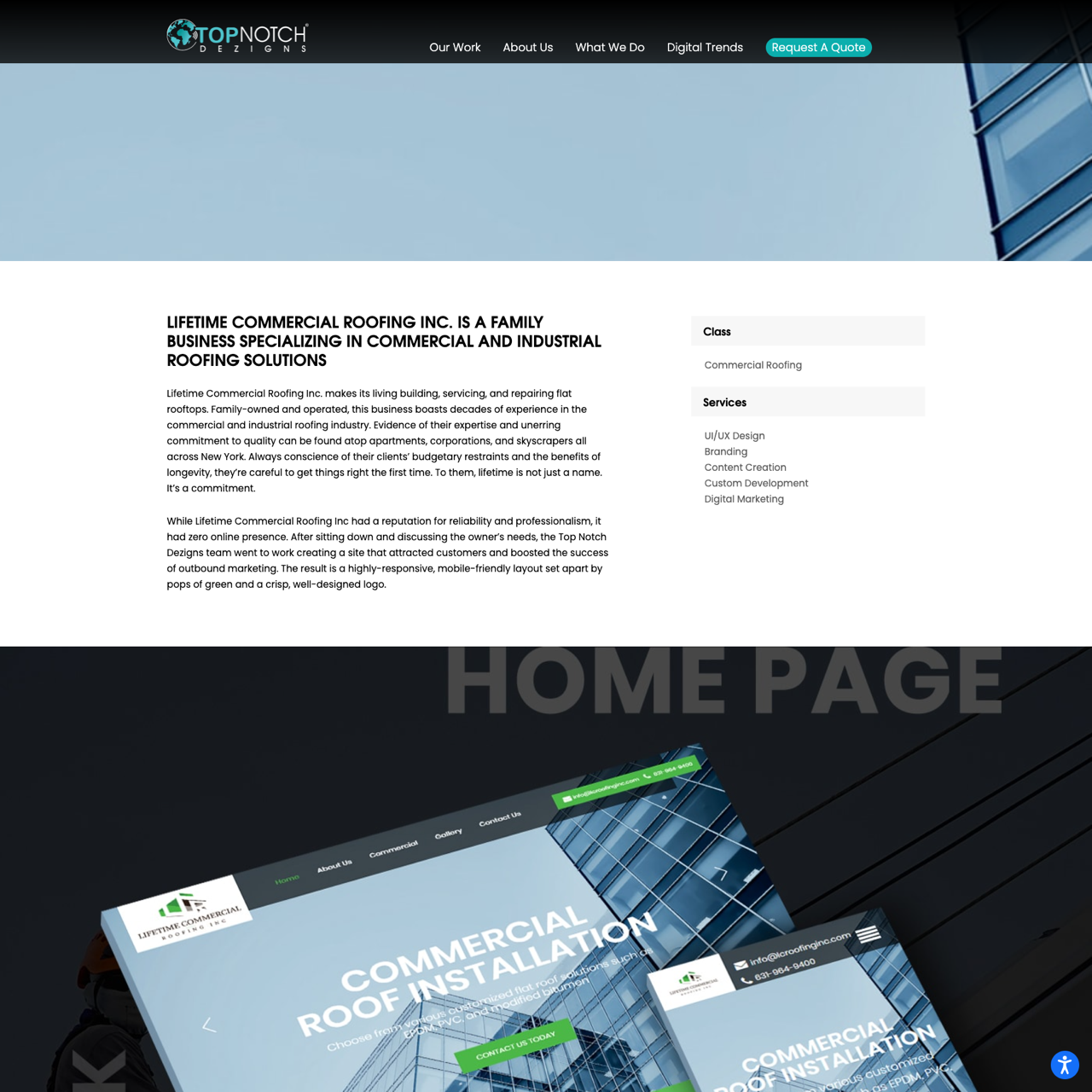 Lifetime Commercial Roofing Inc. had zero online presence, but Top Notch Dezigns transformed their brand by creating a mobile-friendly site with pops of green and a crisp logo. The result was a highly-responsive layout that boosted customer engagement and outbound marketing success. The new site improved conversion rates, increased brand awareness, and enhanced customer experience while maintaining the company's commitment to quality and longevity. The redesign effectively communicated their expertise and value proposition to a wider audience.