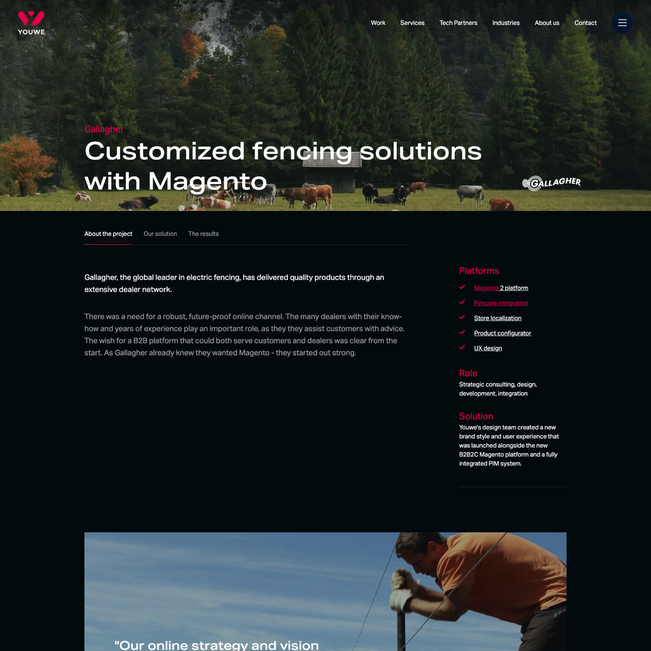 Gallagher, the global leader in electric fencing, needed a robust online channel to serve dealers and customers. Youwe designed a custom Magento module allowing customers to specify fencing parameters and receive tailored recommendations. The platform integrated with Gallagher's ERP, enabling real-time inventory updates and geolocation-based warehouse selection. This ensured fast, localized deliveries within two days. The solution enhanced customer experience and operational efficiency, demonstrating Magento's flexibility and scalability for B2B growth.