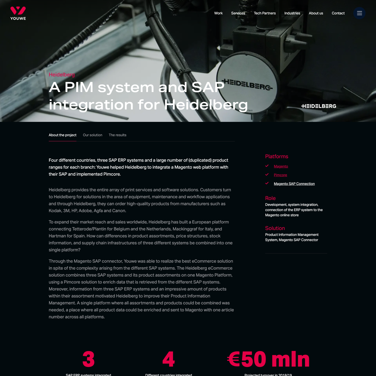 Heidelberg faced challenges integrating four countries' SAP ERP systems and vast product duplication. Youwe implemented a Magento platform with Pimcore to unify data across three SAP systems. The solution enabled seamless product management and global sales, projecting €50m in turnover for 2018/19. By consolidating diverse product assortments and supply chains, the platform streamlined marketing and sales operations, offering a centralized solution for cross-border commerce.