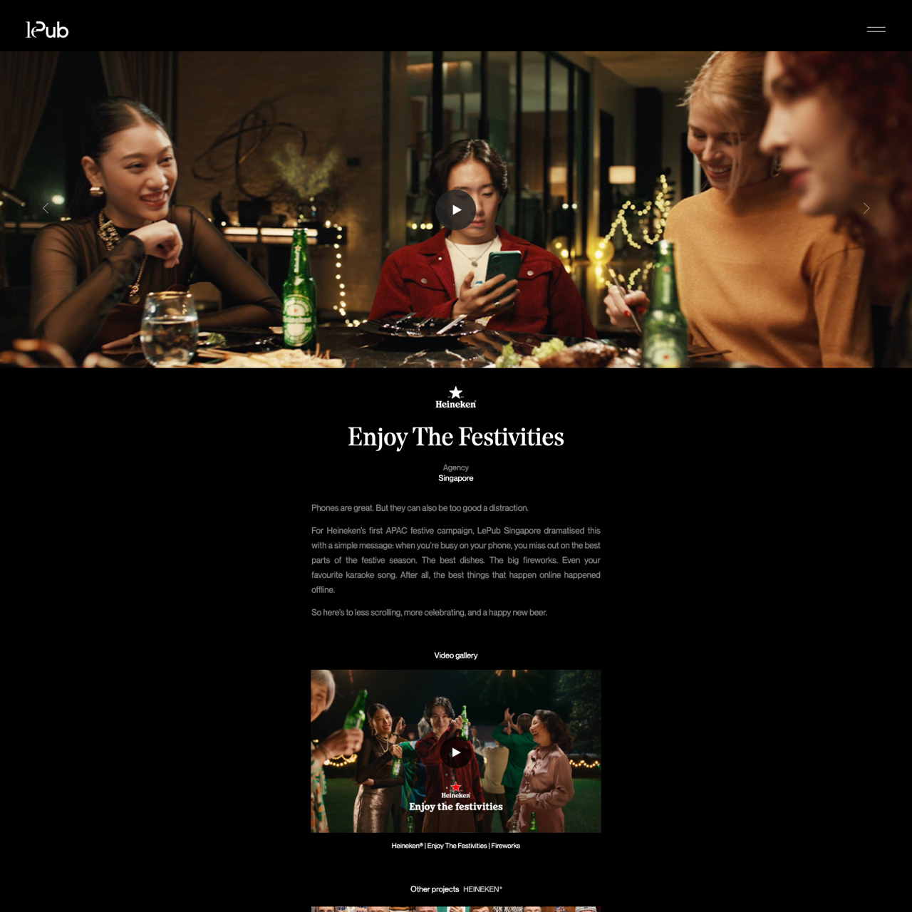 LePub Singapore's APAC festive campaign for Heineken highlighted the tension between digital distraction and real-world celebration, using a simple message that resonated with audiences. By emphasizing the best parts of the season—like dishes, fireworks, and karaoke—the campaign encouraged a shift from scrolling to engaging in the physical world. The result was a renewed appreciation for the tangible experiences that define festive joy. The campaign's success in APAC showcased the power of storytelling to bridge the gap between digital engagement and real-world connection. The brand's message was reinforced through relatable, authentic content that sparked conversations about presence and joy. The campaign's impact was measured by increased engagement and a stronger emotional connection to Heineken's festive spirit.