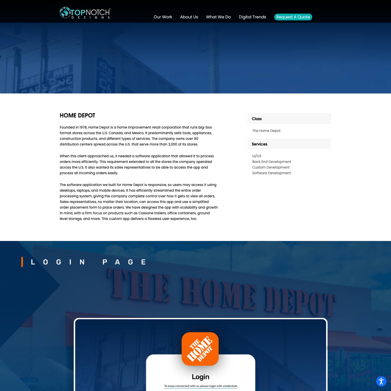 Home Depot needed a software solution to streamline order processing across all its stores. The team developed a responsive app with features like Cassone trailers and office containers, enabling sales reps to access orders from anywhere. The app improved efficiency, allowing full control over order visibility and real-time tracking. It delivered a flawless user experience, reducing processing time and enhancing customer satisfaction. The solution focused on scalability and growth, ensuring consistent operations across all locations.