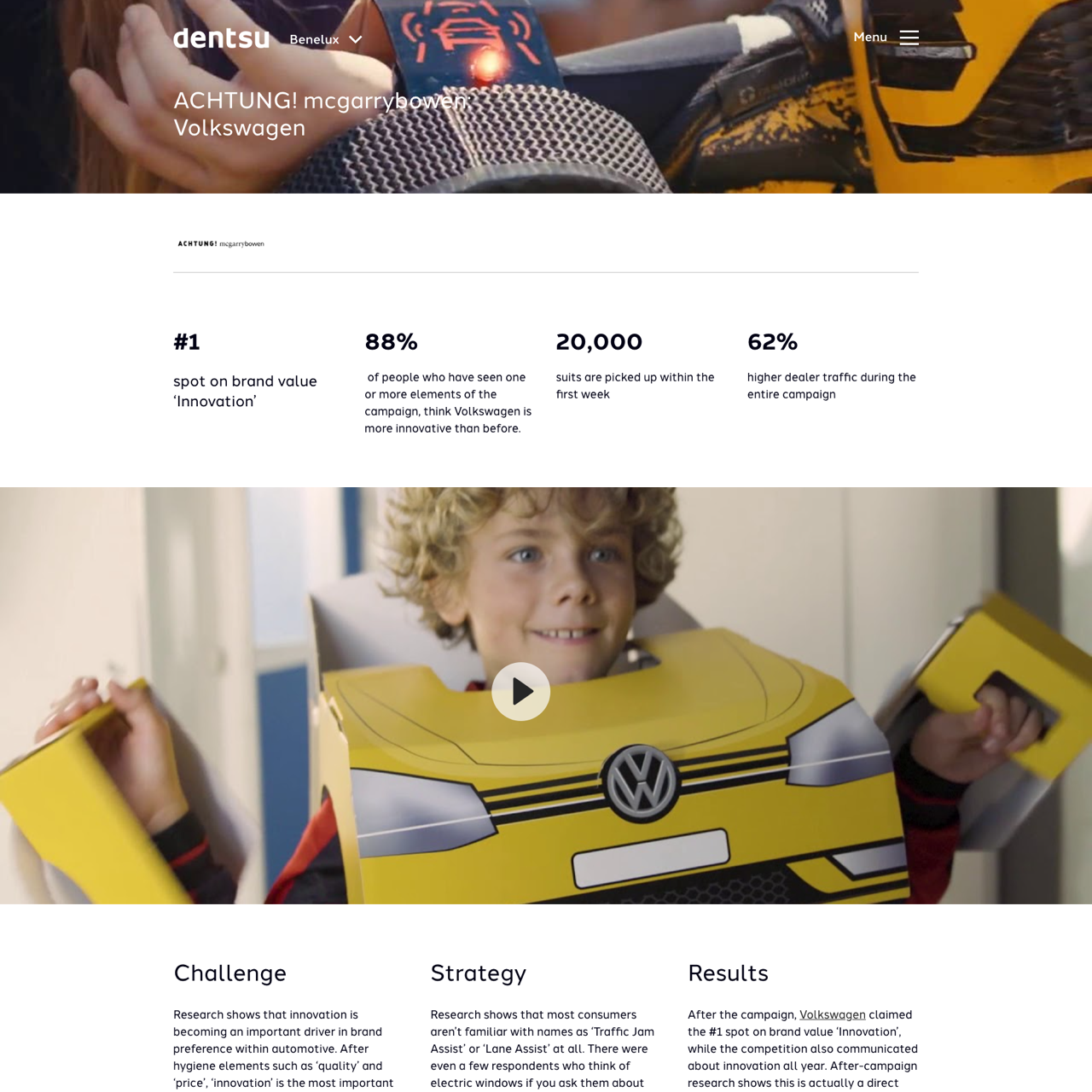 This case study highlights Volkswagen's strategy to humanize innovation through a creative campaign featuring a little boy in a Volkswagen-suit. The campaign showcased the car's advanced features like Traffic Jam Assist and Lane Assist by demonstrating their real-world impact, such as automatic lighting, pedestrian recognition, and backward parking. The result was a 0% increase in perception of innovation, with suits being picked up within the first week and a 20% rise in dealer traffic. By focusing on the effect of technology rather than its complexity, Volkswagen successfully balanced innovation with its established human touch, proving that meaningful advancements can be both cutting-edge and relatable.