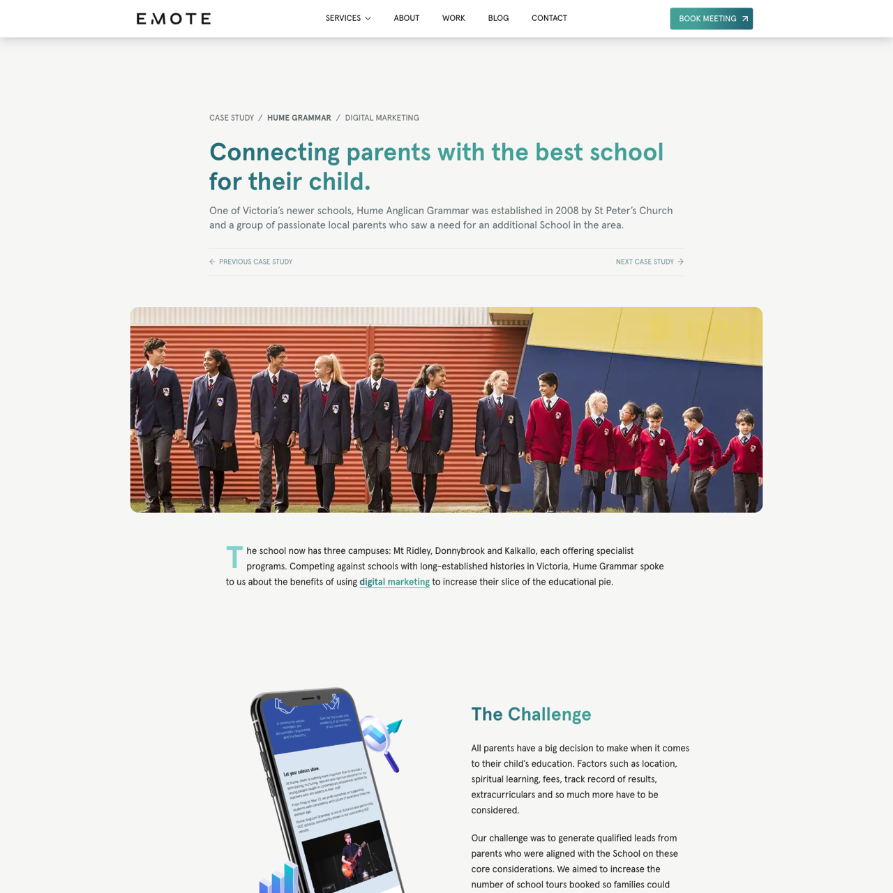 Hume Anglican Grammar faced the challenge of connecting parents with the best educational options in Victoria, competing against established schools. Emote Digital implemented a Google brand campaign and local search strategy, along with display ads and ongoing SEO optimizations to drive qualified leads. By targeting parents’ core concerns—location, spiritual learning, and fees—Hume saw a 30% increase in school tour bookings within six months. The campaign focused on remarketing visitors who left without booking, ensuring conversions from generic keywords while keeping costs low. The results highlighted the effectiveness of targeted digital marketing in enhancing school visibility and enrollment rates.