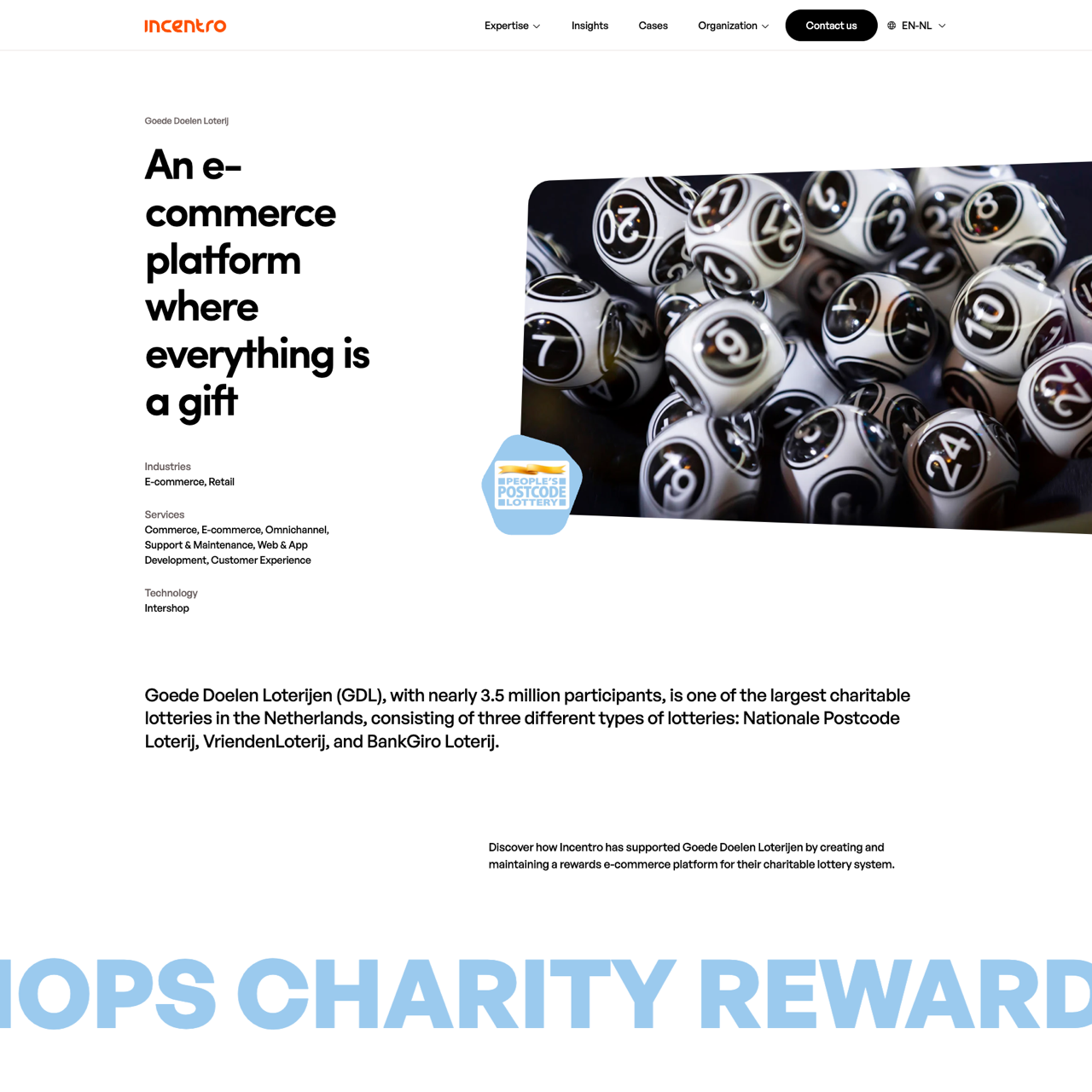 Incentro designed an unconventional e-commerce platform for Goede Doelen Loterij, a charitable lottery system with 3.5 million participants. The platform enables winners to redeem gift codes for rewards, distinct from traditional lotteries. Key features include tailored solutions for National Postcode Loterij, VriendenLoterij, and BankGiro Loterij, each with unique redemption mechanisms. The platform ensures seamless integration with Intershop, optimizing user experience and operational efficiency. By focusing on charitable goals, the solution aligns with GDL’s mission of rewarding participants through gifts, enhancing engagement and accessibility for diverse lottery types.