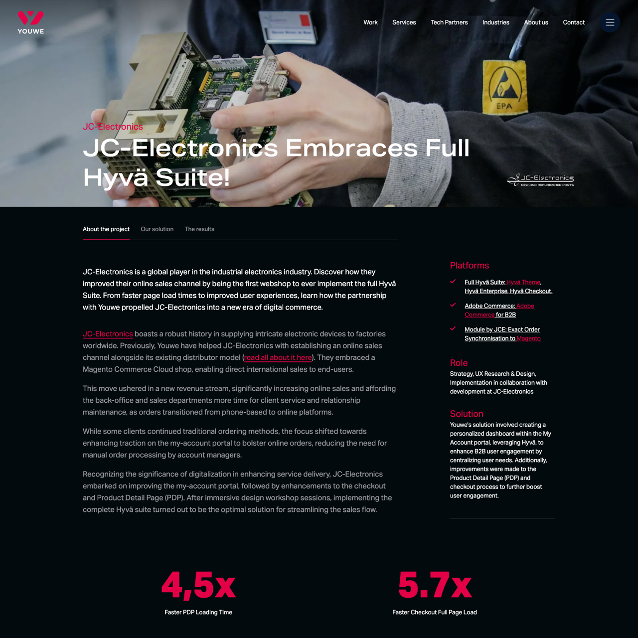 JC-Electronics transformed their online sales channel by adopting the full Hyvä Suite, enabling faster page load times and improved user experiences. The partnership with Youwe delivered a 4,5x increase in sales efficiency, streamlining the back-office process and reducing manual order handling. By implementing the Hyvä suite, JC-Electronics enhanced the my-account portal and checkout experience, resulting in a 5.7x faster full-page load time. The developer-friendly nature of Hyvä ensured seamless integration, driving a new era of digital commerce for the brand. The implementation focused on optimizing core web vitals, delivering a more intuitive and efficient online platform for customers.
