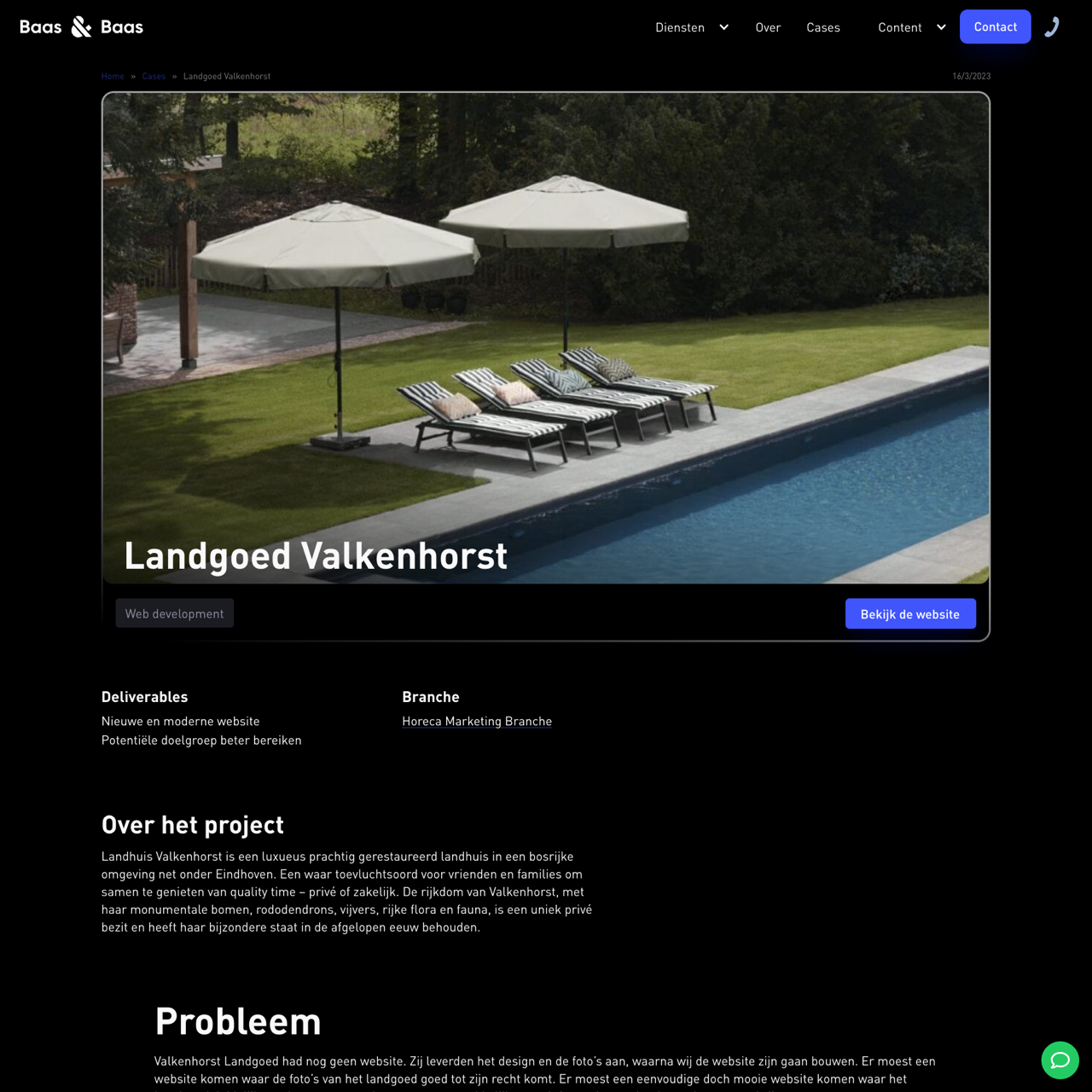 Baas & Baas redesigned the website for Landgoed Valkenhorst, creating a visually appealing and SEO-optimized platform that highlights the property's unique features. The new site improves visibility in search engines and provides a seamless experience for potential buyers. The site features a walkthrough design, informative content, and mobile-friendly functionality, helping the brand reach its target audience more effectively.