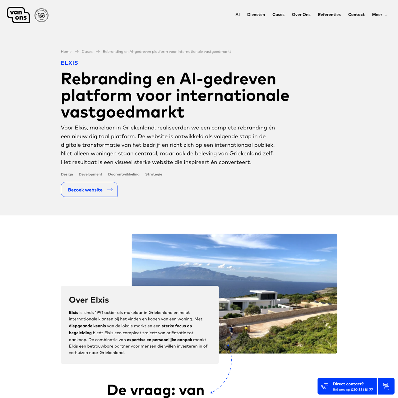 Elxis, a real estate agency with 22 years of experience, needed a modern platform to better serve its international client base. The new Laravel-based site features advanced search, filtering, and presentation capabilities, along with a responsive design and AI-powered search. The platform enhances user experience and drives conversion through intuitive navigation and interactive maps. The rebranding includes a clean, modern look and powerful functionality to support the agency's growth and expansion into new markets.