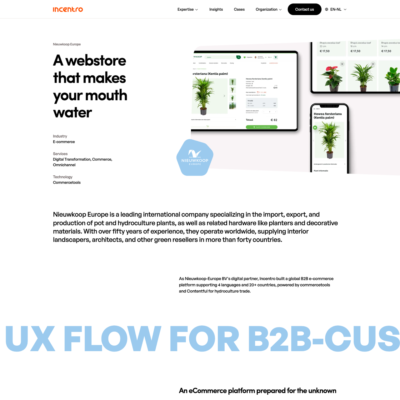 Nieuwkoop Europe, a global leader in hydroculture plant imports, partnered with Incentro to build a scalable B2B e-commerce platform. The project focused on creating a seamless UX for B2B customers, leveraging a headless architecture with Contentful and commercetools. By adopting a microservices-based approach, the platform enabled rapid feature additions and future-proof scalability. The result was a streamlined, mobile-friendly experience that boosted conversion rates and customer satisfaction. The MACH philosophy guided the transformation, ensuring flexibility and adaptability for evolving business needs. The platform now supports 4 languages and 20+ countries, driving sustainable growth in the green reselling sector.